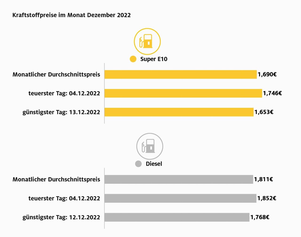 Zumindest zum Jahresende zeigte sich eine gewisse Entsapnnung an den Zapfsäulen. Im Dezember war, wie schon im November, ein Rückgang der monatlichen Durchschnittspreise zu erkennen. Super E10 kostete im letzten Monat des Jahres im Durchschnitt 1,690 Euro je Liter und damit gut 14 Cent weniger als im November. Ein Liter Diesel lag mehr als 15 Cent unter dem Vormonatsniveau: Für einen Liter wurden im Monatsmittel 1,811 Euro fällig. (aum)