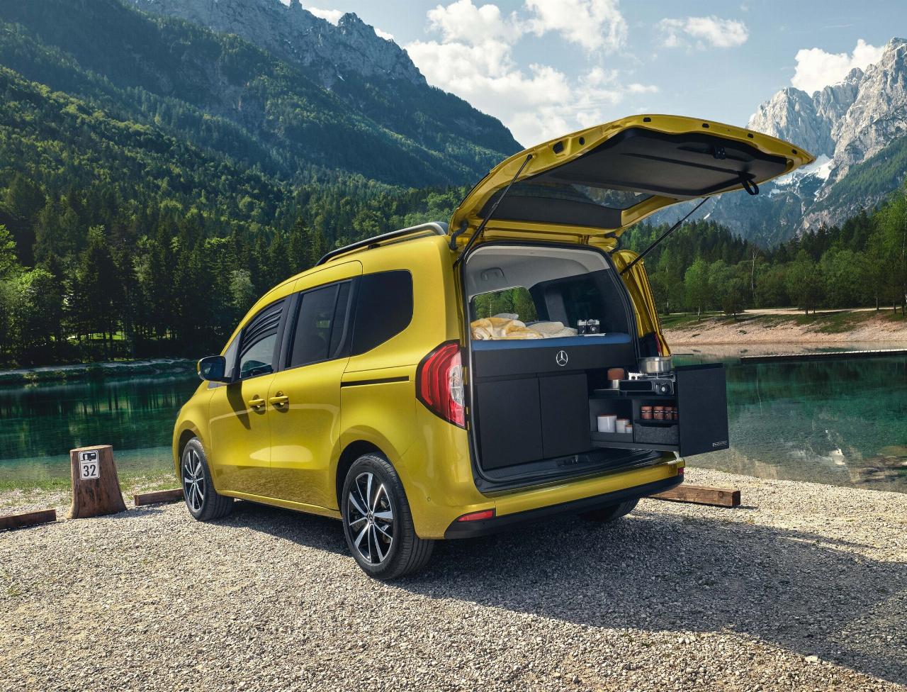 Das Marco Polo Modul verwandelt sowohl die Mercedes-Benz T-Klasse als auch den Citan Tourer in Standardlänge im Handumdrehen in einen Micro-Camper. Das flexibel ein- und ausbaubare Camping-Modul wird im Kofferraum des jeweiligen Fahrzeugs platziert und an Verzurr-Ösen fixiert. Es besteht aus einer serienmäßigen Betteinheit für zwei Personen sowie einer optionalen Kücheneinheit mit Spülbecken und Gaskocher. Auf Wunsch kann auch eine Kühlbox ergänzt werden, die in der Kücheneinheit Platz findet.
