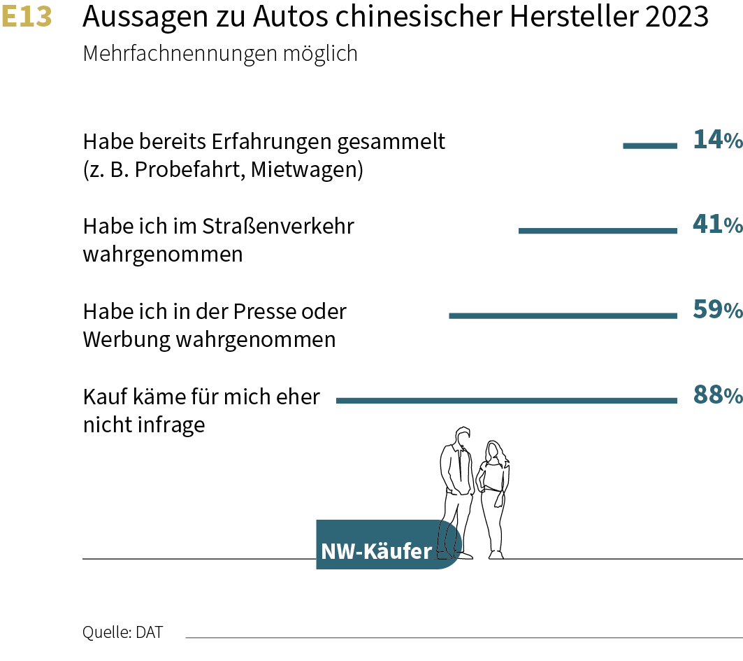 Große Skepsis gibt es bei den Autokäufern gegenüber Modellen aus China. Zwar haben schon 59 Prozent in Presse und Werbung von chinesischen Autos gehört. aber für 88 Prozent käme ein Kauf solcher Fahrzeuge derzeit eher nicht infrage.
