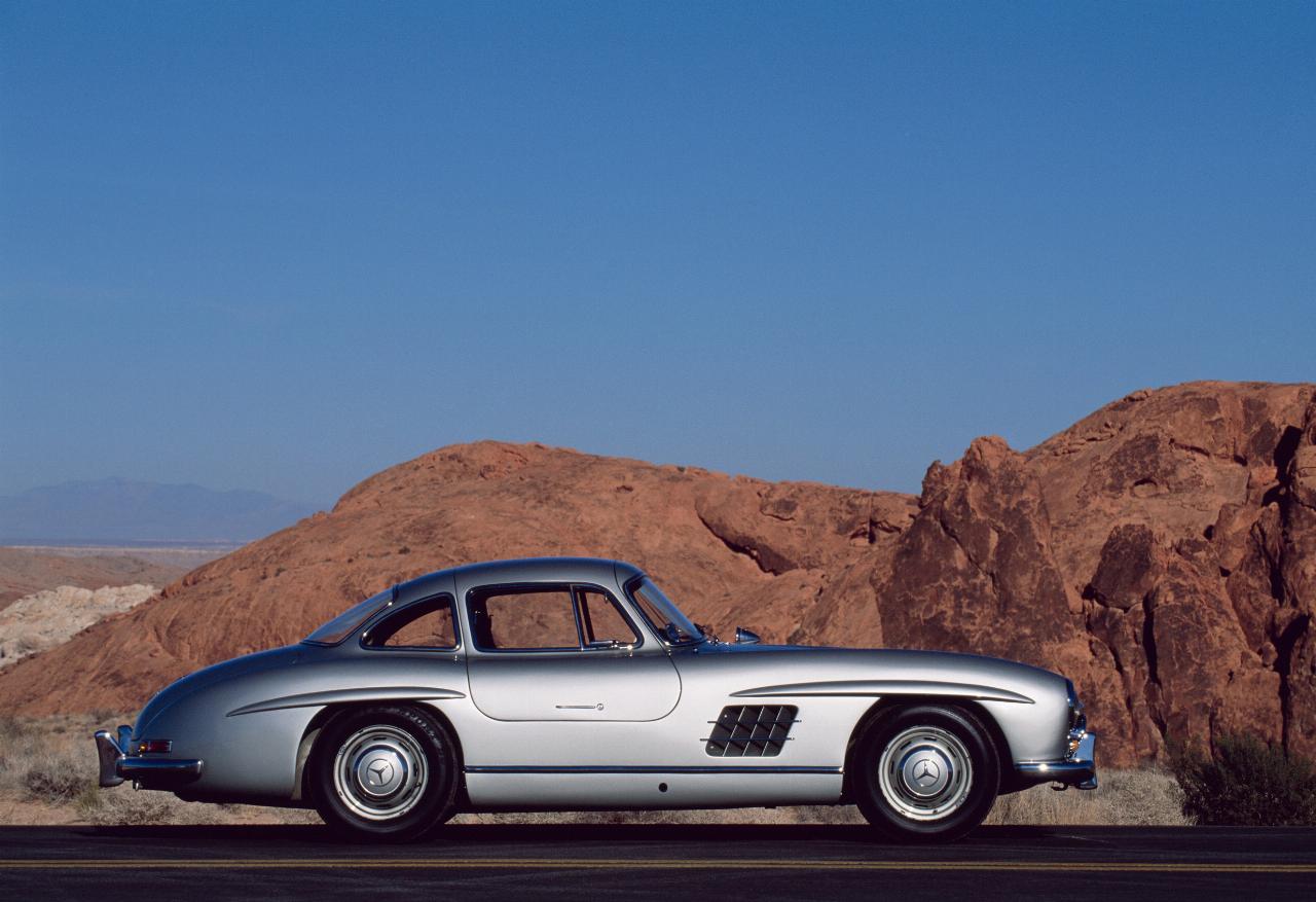 Er zählt heute zu den begehrtesten Sportwagen aller Zeiten: Der 300 SL, mit dessen Vorläufer W194 die Stuttgarter nur sieben Jahre nach dem verlorenen Krieg wieder die ersten Siege holten – allerdings im sportlichen Wettkampf. Die perfekt proportionierte Form wird akzentuiert durch langgezogene Kotflügelverbreiterungen und nach oben öffnende Flügeltüren. Unter der Haube steckt ein Dreiliter-Sechszylinder, mit Direkteinspritzung bis zu 215 PS stark.