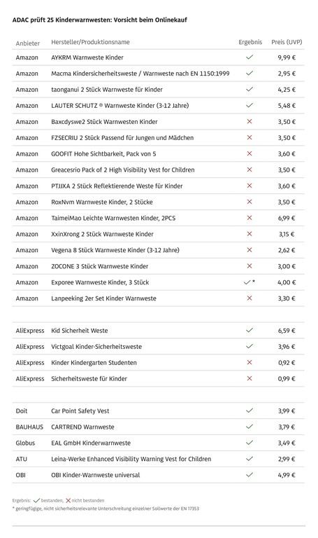 Fünf Kinderwarnwesten wurden im Baumarkt eingekauft. Sie zeigten ausnahmslos gute Ergebnisse und reflektierten alle im Rahmen der Norm. Alle weiteren 20 Produkte stammen aus dem Online-Handel. Hier zeigt sich ein deutlich anderes Bild: Nur sieben Warnwesten lieferten zufriedenstellende Ergebnisse, drei reflektierten nicht gut genug und zehn Produkte gar nicht.