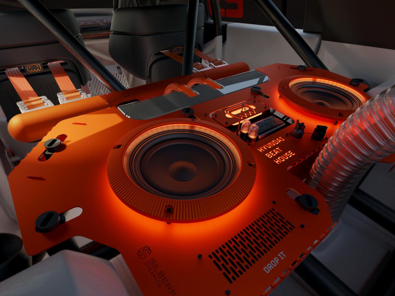 Beim Cockpit setzten die Gestalter auf ein reduziertes, gamifiziertes Design mit Sportsitzen, Überrollkäfig und spezieller Instrumentenanzeige für ein intensives Fahrgefühl. Alle Bedienelemente sind vollständig anpassbar. Für die Elektrostudie wurde auch ein markantes, individuelles Fahrgeräusch entwickelt. Der Hyundai Insteroid verfügt über einen Drift-Modus und ein integriertes „Beat House“-Soundsystem. Das so genannte Message Grid ermöglicht personalisierte Interaktionen. An verschiedenen Stellen sichtbar, symbolisiert das Boost-Icon verschiedene, einzigartige Persönlichkeiten und soll die emotionale Verbindung zwischen Auto und Fahrer stärken.