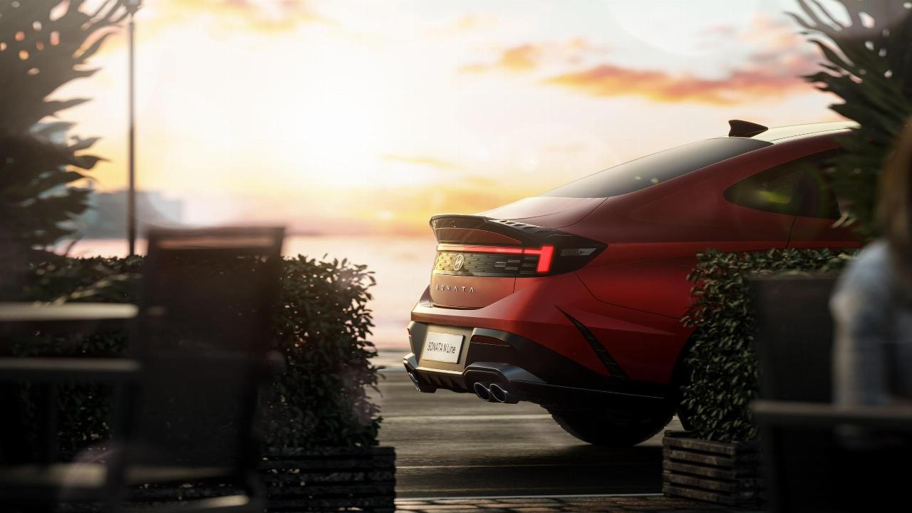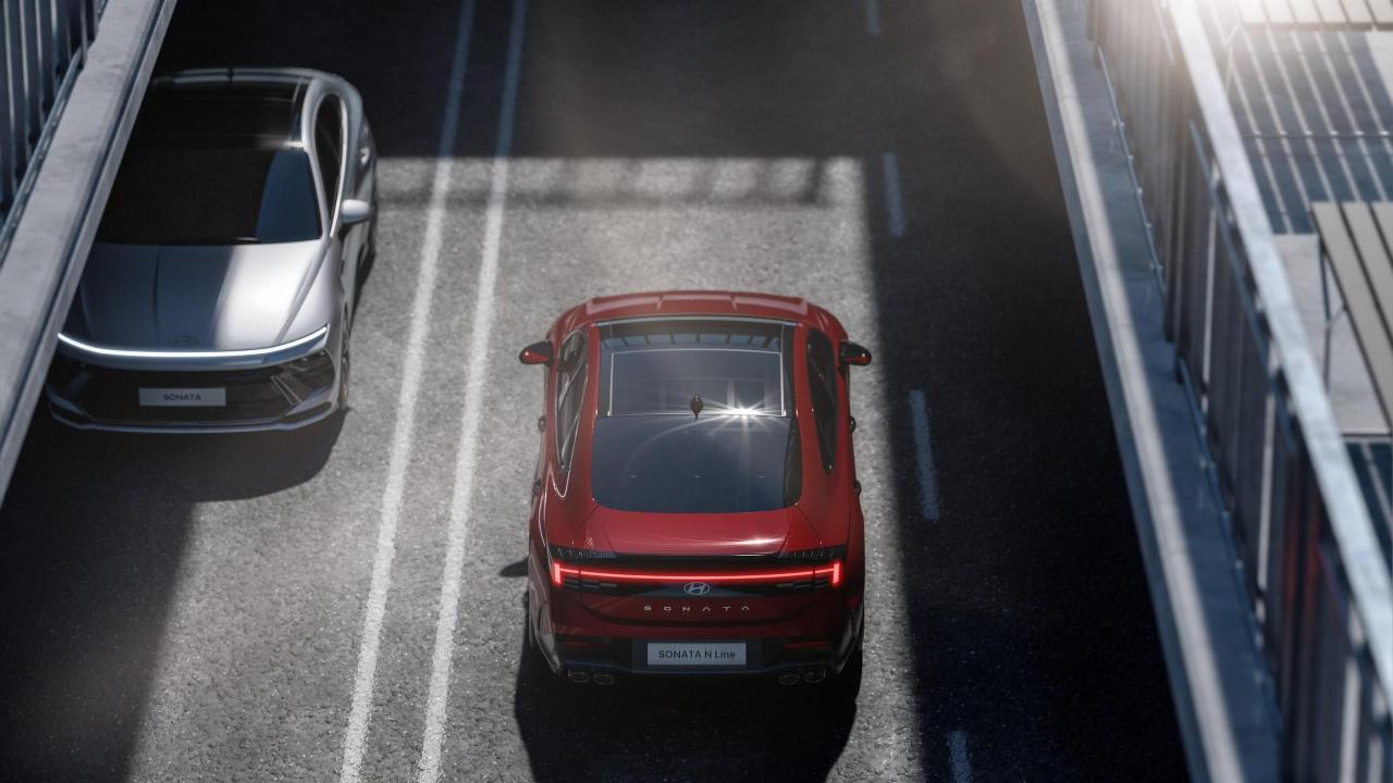 Schon bislang hatte sich der Sonata mit ungewöhnlichem Design profiliert: Das Tagfahrlicht ging in eine Chromleiste über, die bis zu den Fenstern reichte. Jetzt gibt es statt dessen einen schlanken LED-Lichtstreifen, der – wie beim Staria und dem neuen Kona – über die gesamte Fahrzeugbreite reicht. Er korrespondiert mit horizontal gezeichneten Rückleuchten. Damit präsentiert sich die Limousine außergewöhnlich sportlich und futuristisch.