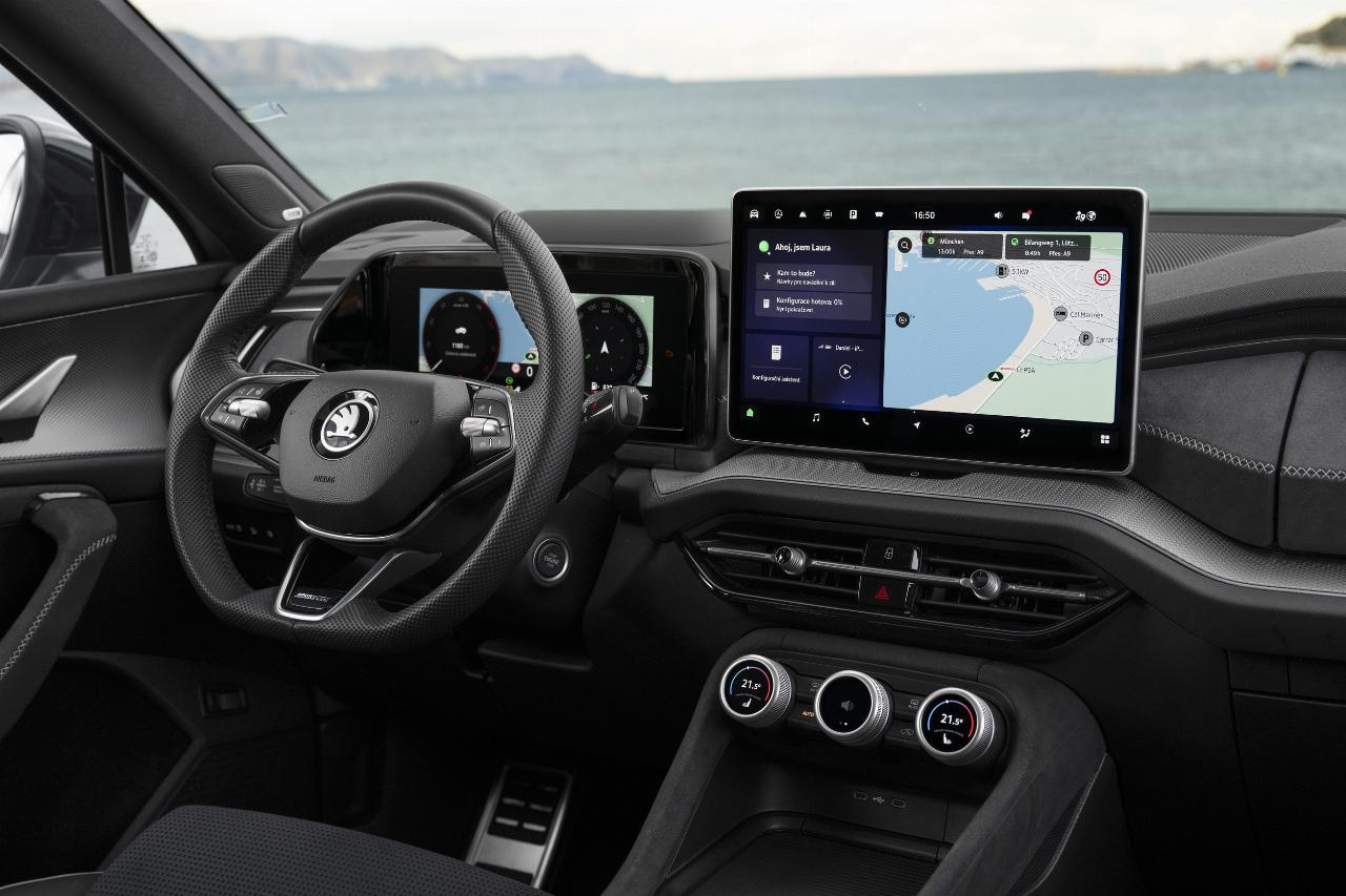 Der Gangwahlhebel des allen Modellen zugeteilten Doppelkupplungsgetriebes sitzt jetzt an der Lenksäule. Das schafft Platz in der Mittelkonsole. Darüber thronen drei runde Drehregler mit jeweils einem kleinen Bildschirm, Smart Dials genannt. Die äußeren beiden sind für Klimaanlage, Sitzheizung und – erstmals im Kodiaq – Sitzlüftung reserviert. Der mittlere Regler steuert bis zu vier Funktionen, die der Nutzer selbst auswählen kann, zum Beispiel die Lautstärke der Musikanlage, den Fahrmodus oder den Maßstab der Navigationskarte. Vor dem Fahrer zeigt ein Zehn-Zoll-Display die wichtigsten Fahrdaten an.