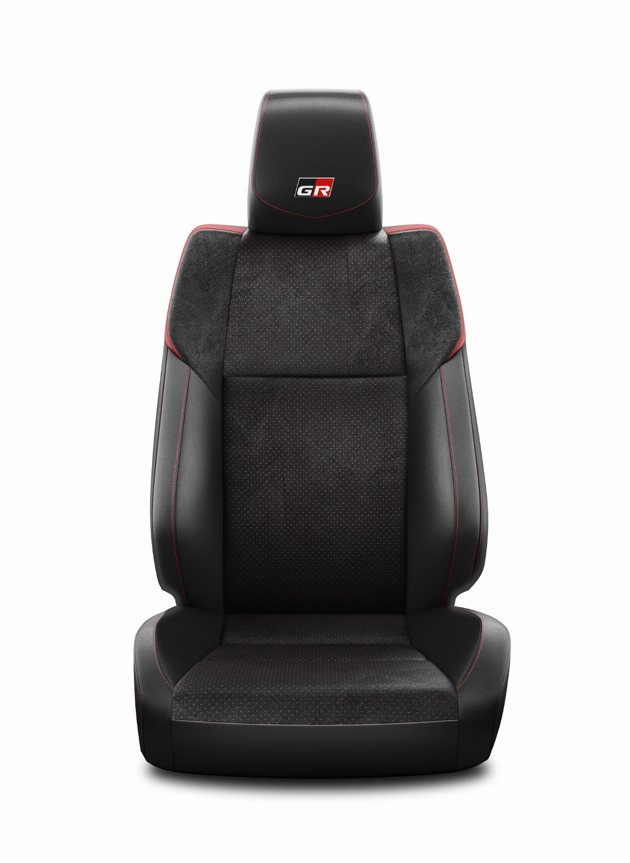 Die Front betonen beim GR neue, größere Nebelscheinwerfer-Einfassungen, einen schwarzen Kühlergrill in einem besonderen Mesh-Design und einen horizontalen Mittelstreifen mit Toyota-Schriftzug statt des Markenemblems. Die 17-Zoll-Alufelgen zeigen einen Kontrast von schwarz lackiert und blank bearbeitet. Schwarz sind auch die Spiegelgehäuse, Trittbrettern, Radhausausbuchtungen und der Hecktürgriff als Kontrast zu den roten Federn und Dämpfern. Im Innenraum zieht sich eine rote Zierlinie über das Armaturenbrett und die vorderen Sportsitze sind in Teilleder mit roten Perforierungen und Kontrastnähten gehalten. Der GR-Sport-Schriftzug findet sich auf den Sitzlehnen, den Fußmatten, dem Startknopf sowie der Animationsgrafik des Informationsdisplays.