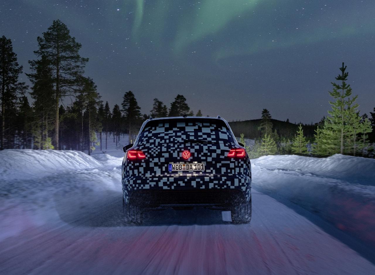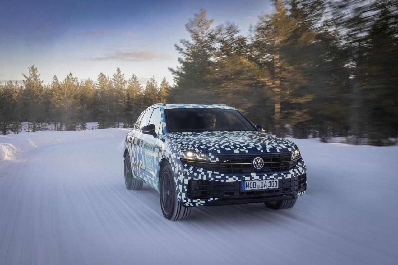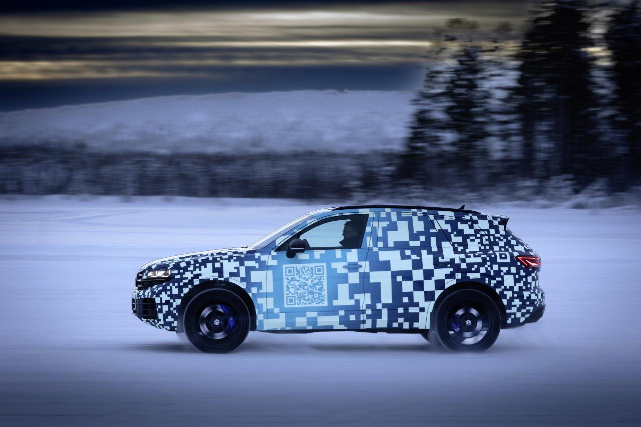 Die Erprobungsfahrzeuge sind noch durch Pixel eines überdimensionalen QR-Codes getarnt. Wer ihn mit dem Smartphone scannt, gelangt auf die Online-Seite Volkswagen-Touareg, die weitere Informationen zur Modellpflege liefert.