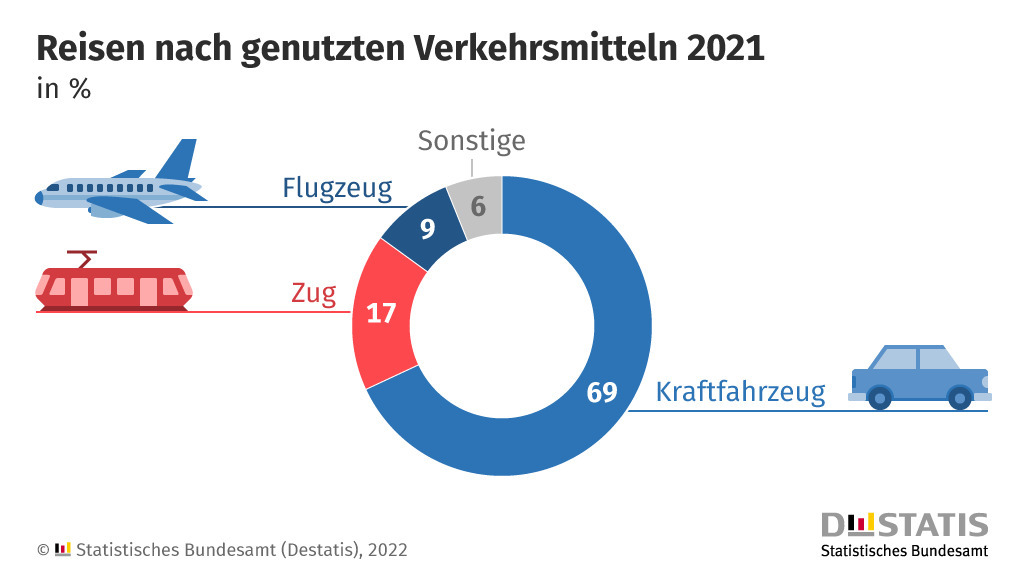 59 Prozent der Reisen ins Ausland wurden mit dem Auto unternommen. Bei Inlandsreisen lag der Anteil bei 72 Prozent. 30 Prozent der Auslandsreisen wurden im Jahr 2021 mit dem Flugzeug zurückgelegt. Der Anteil innerhalb Deutschlands lag bei lediglich einem Prozent. Jede fünfte Reise (22%) im Inland erfolgte 2021 mit der Bahn. Bei Auslandsreisen wurde der Zug für fünf Prozent der Reisen als Verkehrsmittel genutzt.