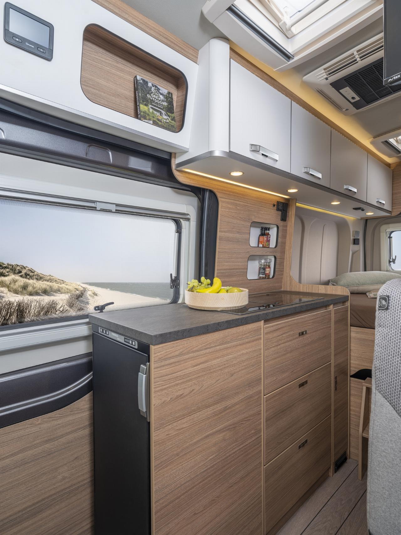 VW Nutzfahrzeuge ist ohnehin zum bevorzugten Partner von Knaus-Tabbert avanciert. Vor kurzem wurde eine strategische Zusammenarbeit bekanntgegeben. Der Van TI, ebenfalls ein Teilintegrierter für rund 80.000 Euro, rollt künftig auf dem Fahrgestell des Crafter, der zumindest teilweise den baugleichen MAN TGE im Knaus-Programm ablöst. Zweifarblackierung, Luftfederung und die allfälligen Assistenz-Sicherheitssysteme sind bei ihm zu haben. Gerüchteweise will die Marke den Crafter auch als ausgebauten Kastenwagen entwickeln, der sich dann in die Boxlife-Familie einreiht, die bislang ausschließlich auf Fiat basiert.