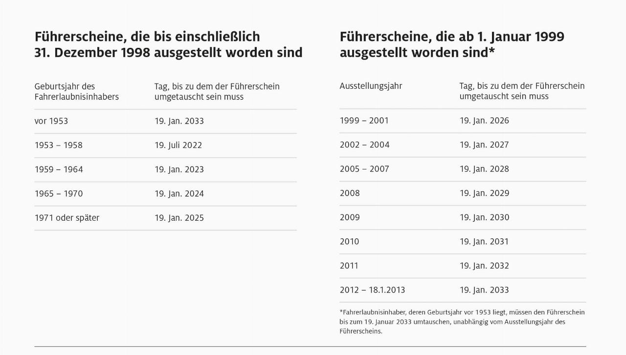 Kraftfahrer ab Geburtsjahrgang 1971, die noch einen Papierführerschein besitzen, müssen ihn bis spätestens 19. Januar 2025 in die heute gebräuchliche Form (Scheckkarte) umtauschen. Darauf weist der ADAC hin. Damit verschwinden nun auch die letzten Papierführerscheine, die noch im Umlauf sind. Mit einer Ausnahme: Diejenigen, die vor 1953 geboren sind, müssen ihren Führerschein erst bis 2033 getauscht haben. Alte Scheckkartenführerscheine, die zwischen 1999 und 18. Januar 2013 ausgestellt worden sind, müssen ebenfalls ab 2026 verpflichtend getauscht werden.
