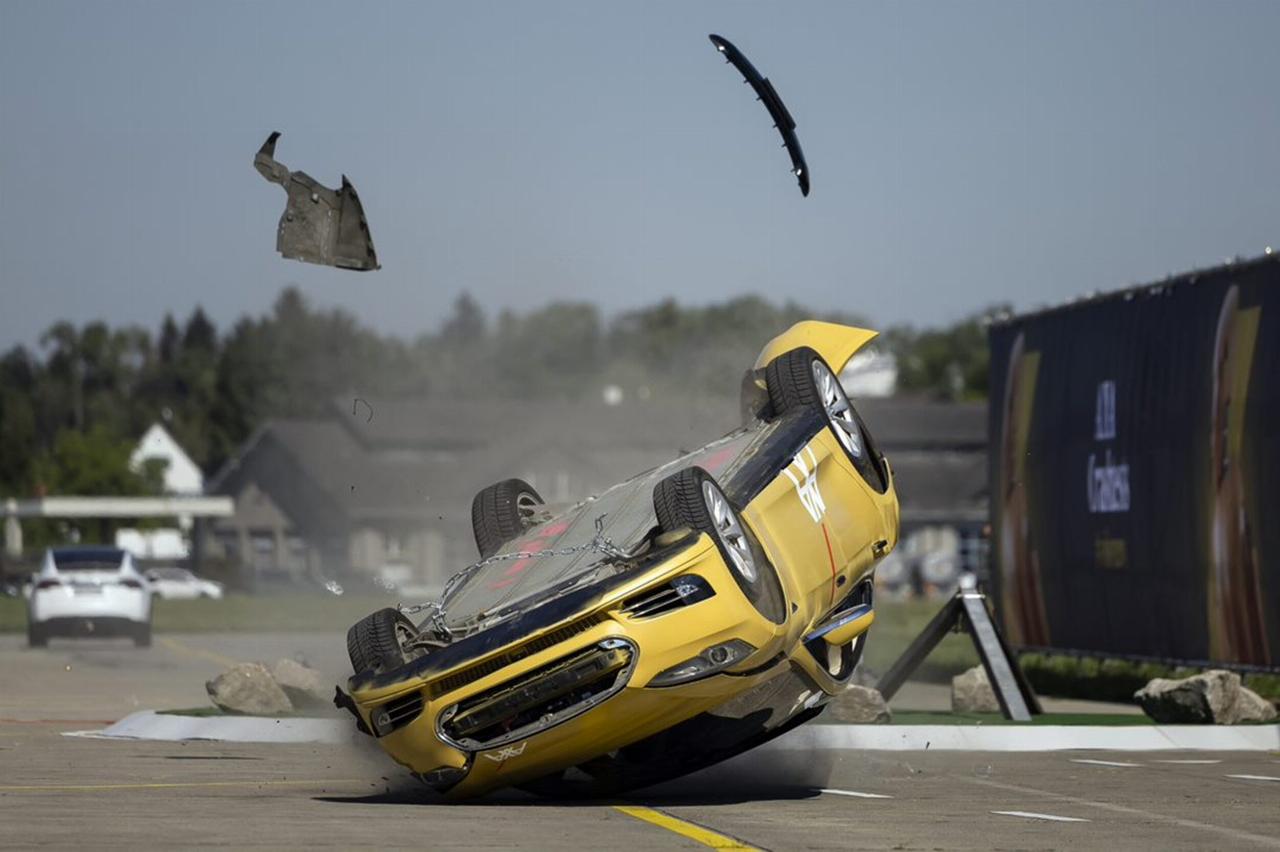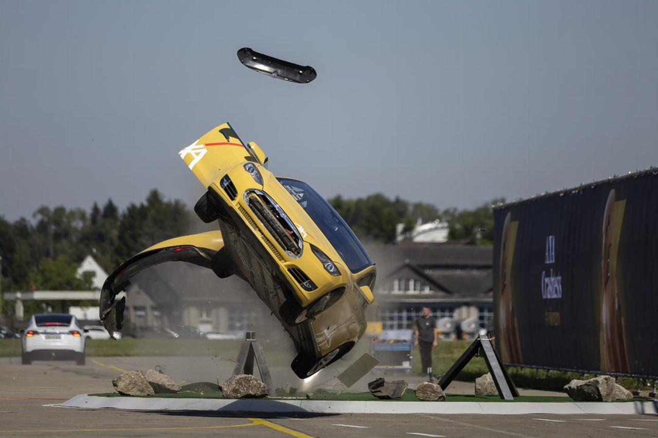 Mit diesem Problem beschäftigte sich auch der erste Crashtest, bei dem simuliert wurde wie ein Tesla-Fahrer vermeintlich nur kurz auf das Strompedal drückte und durch die starke Beschleunigung die Kontrolle über das Fahrzeug verlor. Er fuhr mit überhöhter Geschwindigkeit auf einen Kreisel zu, konnte nicht mehr bremsen und überfuhr das Hindernis in der Mitte. Folge: Das Auto überschlug sich und es kam aufgrund des unebenen Untergrundes zu einer starken Beschädigung des Unterbodens.