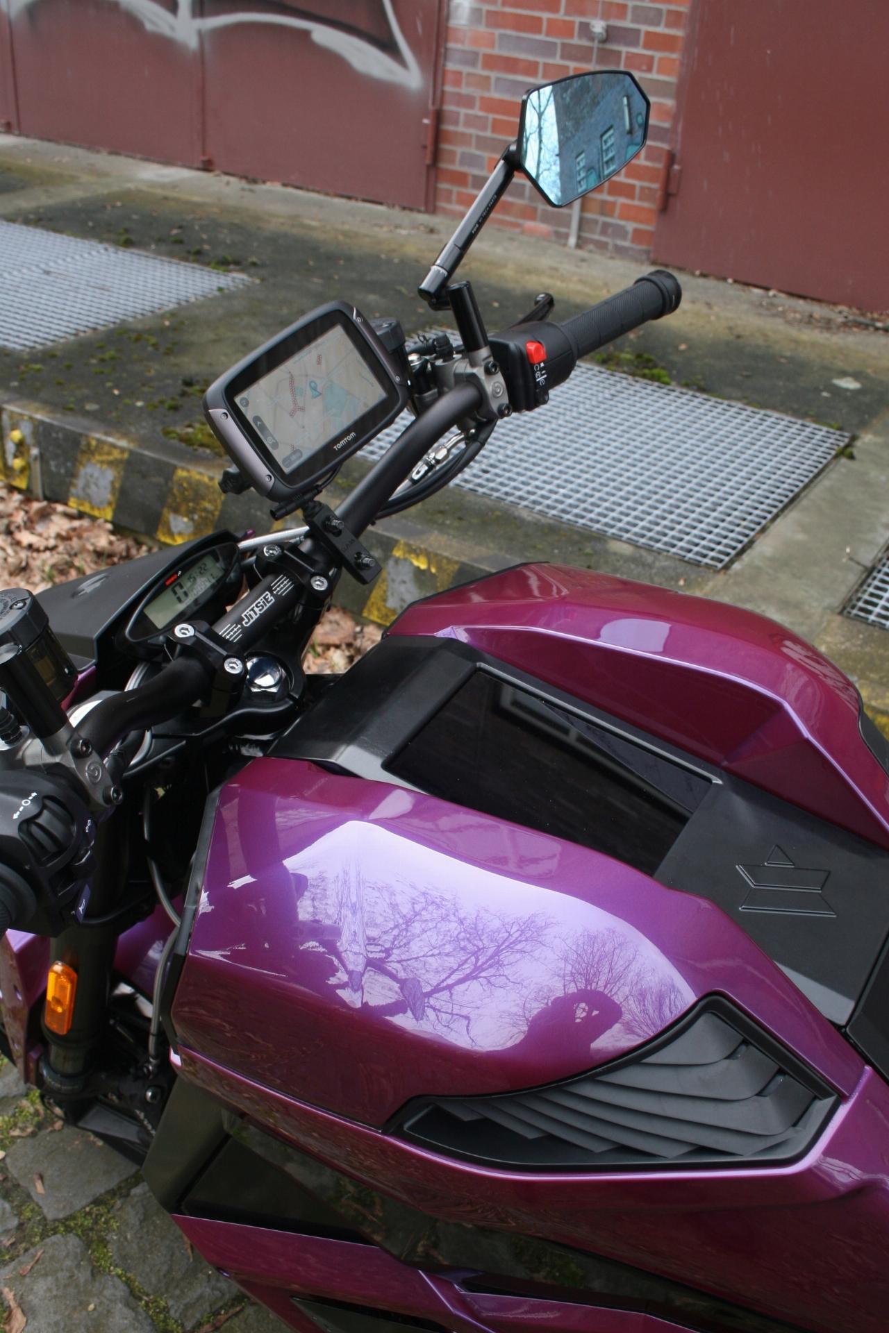 Kurzbeinigen dürften die vorderen Fußrasten auf Dauer etwas unbequem sein, dafür passt es hinten umso besser. Die Brembo-Bremsen fühlen sich extrem synthetisch an und sprechen auch etwas zu früh an. Aber ohnehin verzögert die Verge viel über die Rekuperation. Auffällig ist der sehr tiefe Schwerpunkt mit dem leichten Vorderbau. So wird die TS vor allem über den Lenker und weniger über Körperdruck zum Richtungswechsel bewegt, folgt aber willig dem Befehl und spielt damit vor allem in der Stadt eine Wendig- und Handlichkeit aus, die man der 245 Kilogramm schweren Maschine gar nicht zugetraut hätte. Und den Zulassungsbehörden nicht, dass sie die Mini-Blinker der Verge, die allenfalls einen Durchmesser von einem Zentimeter haben, genehmigt haben. Sie kommen aus China und sind eines der ganz wenigen Teile, die nicht aus europäischer Fertigung stammen, wie man bei Verge stolz betont.