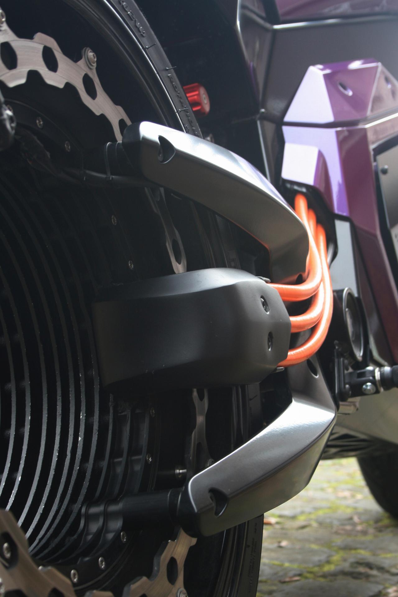 Heraus sticht auf jeden Fall der Antrieb. Die Verge hat einen Felgenmotor, der rechtsseitig montiert ist und mit drei Kabeln an die Batterie und die Steuerungselektronik angeschlossen ist. Das Rad dreht sich um die feststehende Carbon-Felge, die mit vier Streben am Rahmen befestigt ist. Zweite ungewöhnliche Lösung. Der Fahrer hat zwei Paar Fußrasten: Die vorderen für entspanntes Cruisen und die hinten fürs sportive Fahren. Letztere dienen gleichzeitig auch als Soziusrasten bei der Fahrt zu zweit.