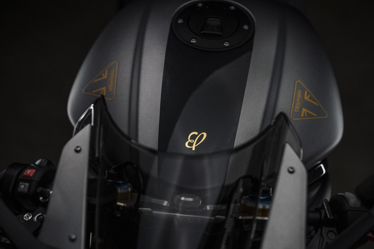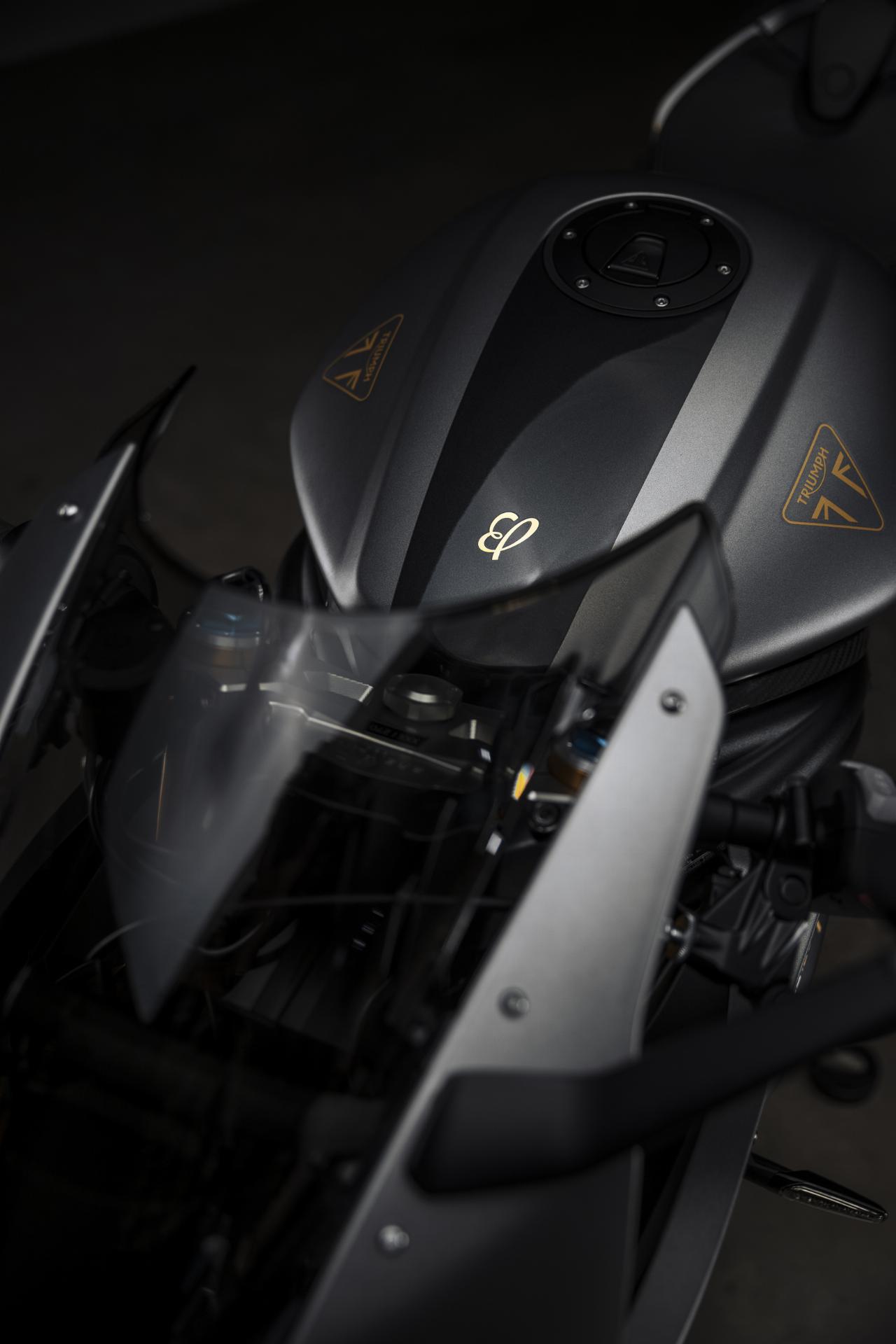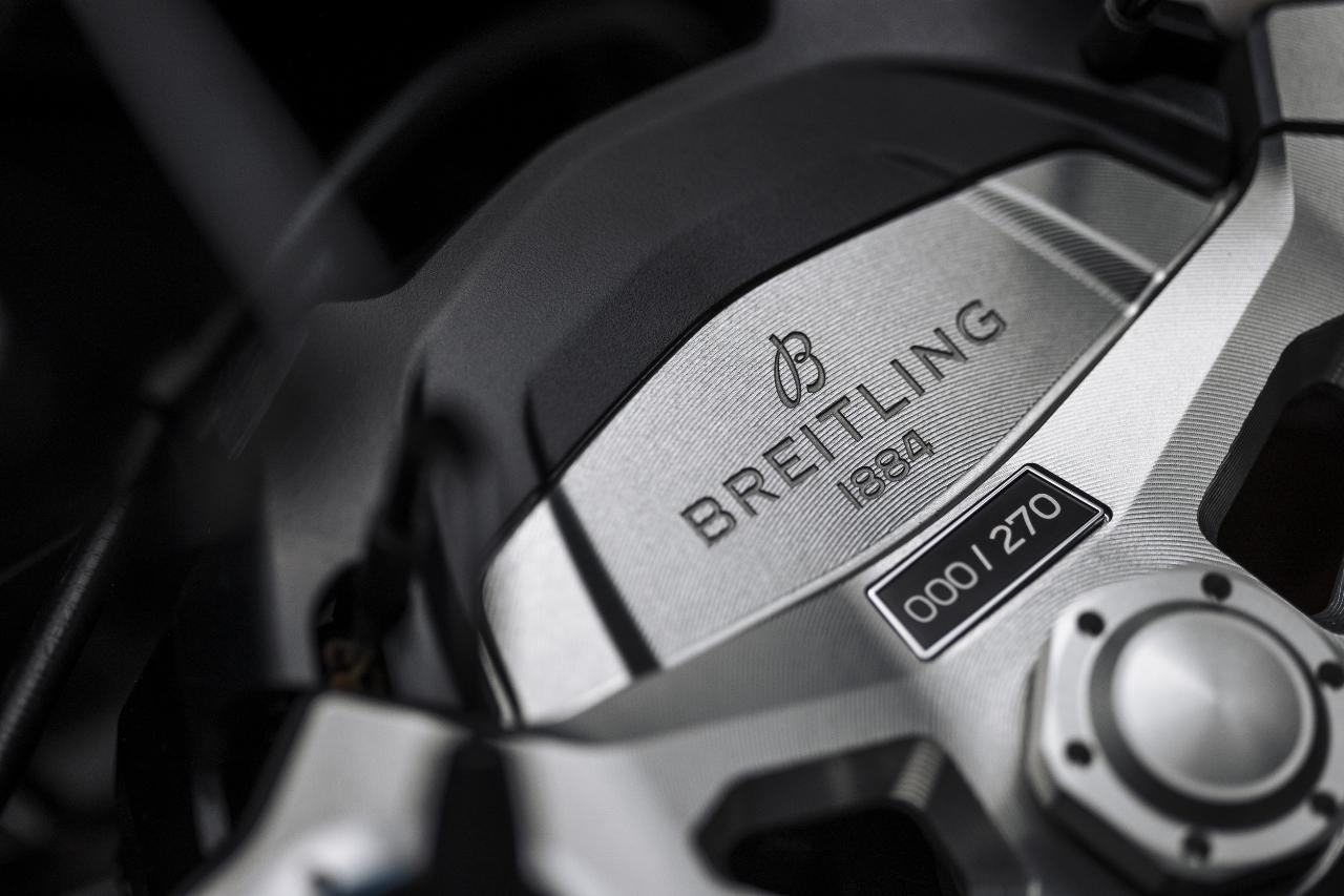 Die Speed Triple Breitling LE trägt eine spezielle Zweifarb-Lackierung mit handgemalten Premium-Golddetails, einen Ledersitz mit „französisch“ ausgeführten Nähten, einen exklusiven Auspuffendtopf von Akrapovic sowie zahlreiche Kohlefaserteile. Partner Breitling ist in einer Reihe von Details auf dem Motorrad präsent: im speziell programmierten Startbildschirm, mit einem gelaserten Logo auf der gefrästen Abdeckung der Hinterradnabe und einer goldenen Plakette auf dem Tank. Jedes Modell trägt seine Seriennummer auf der Gabelbrücke.