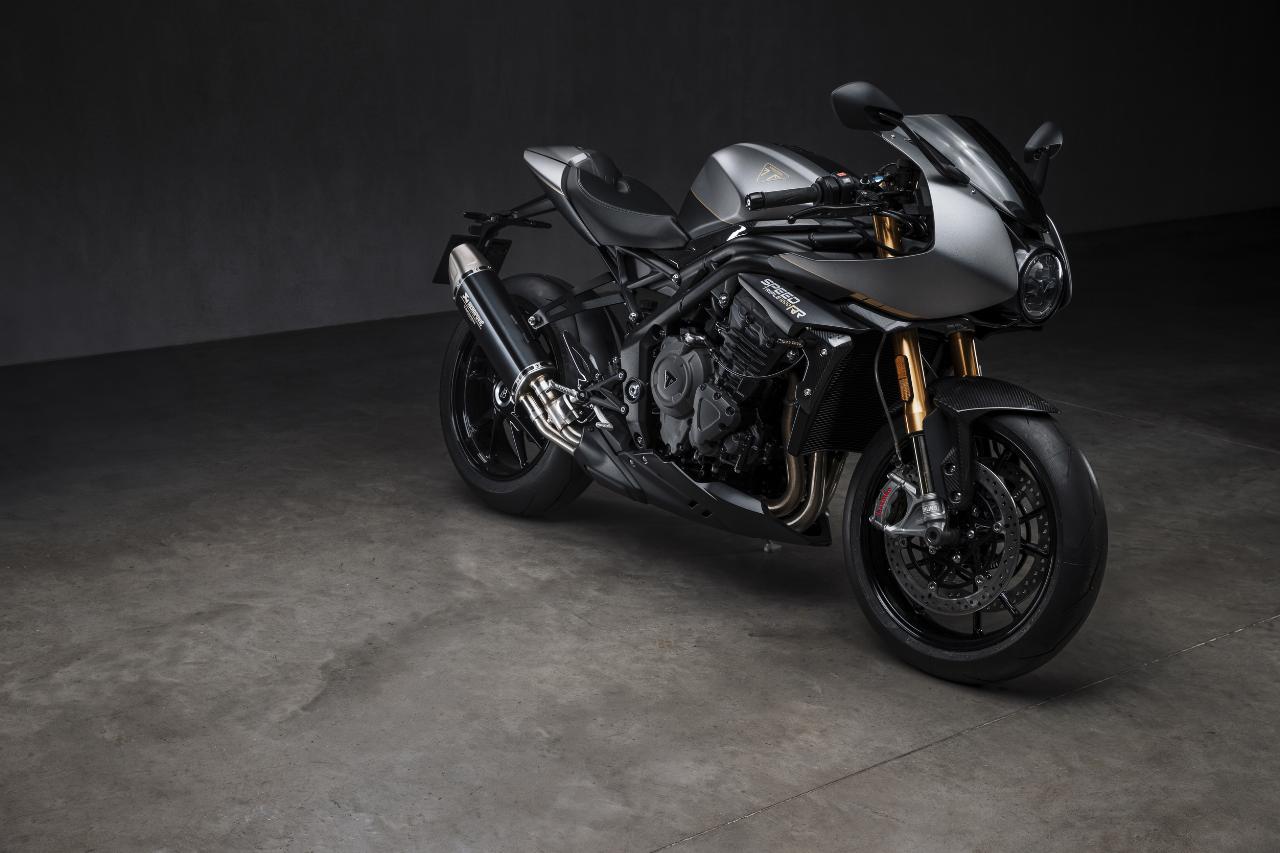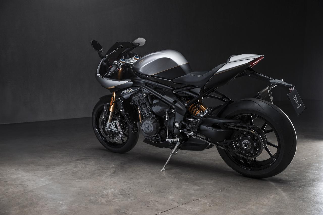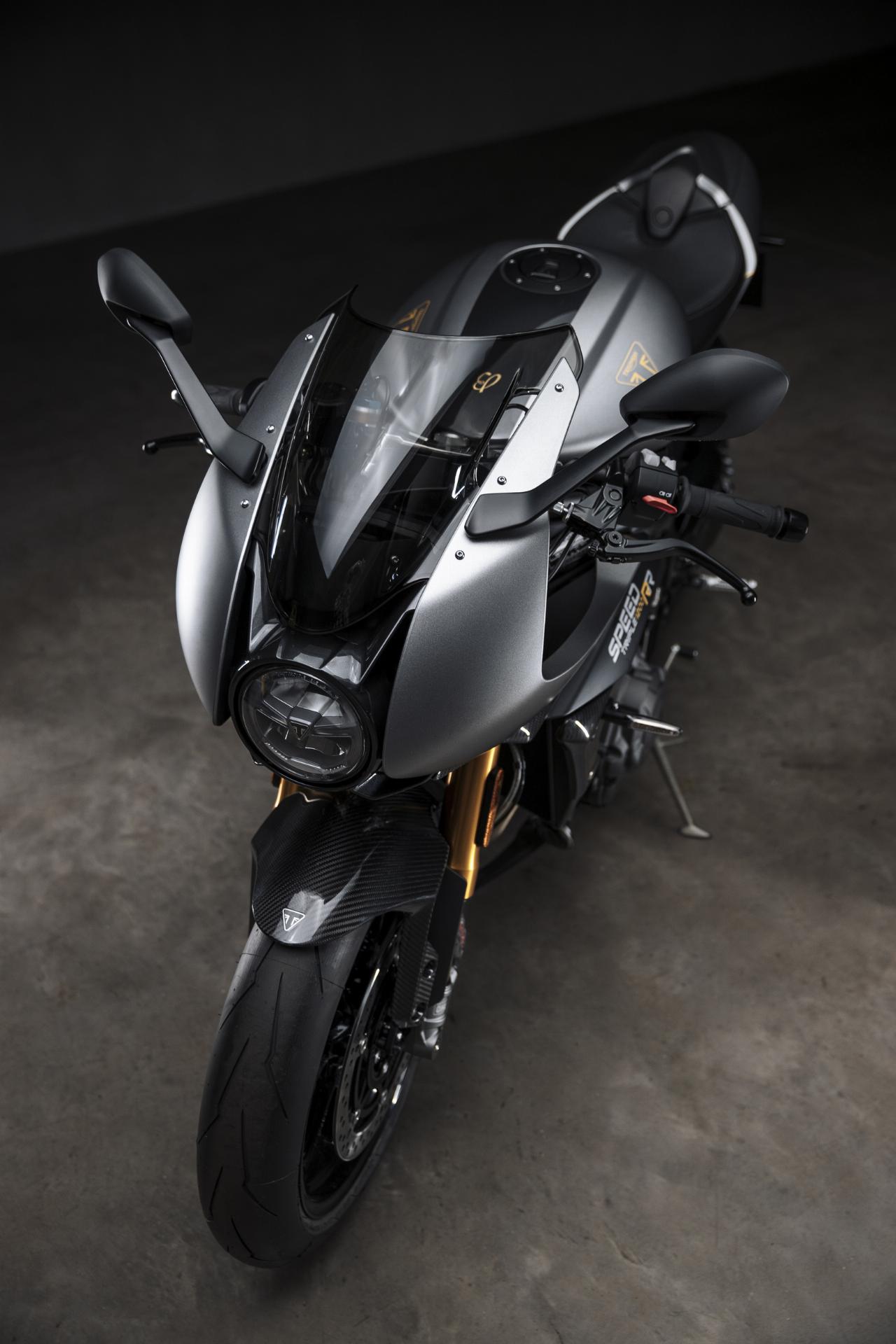 Die Speed Triple Breitling LE trägt eine spezielle Zweifarb-Lackierung mit handgemalten Premium-Golddetails, einen Ledersitz mit „französisch“ ausgeführten Nähten, einen exklusiven Auspuffendtopf von Akrapovic sowie zahlreiche Kohlefaserteile. Partner Breitling ist in einer Reihe von Details auf dem Motorrad präsent: im speziell programmierten Startbildschirm, mit einem gelaserten Logo auf der gefrästen Abdeckung der Hinterradnabe und einer goldenen Plakette auf dem Tank. Jedes Modell trägt seine Seriennummer auf der Gabelbrücke.