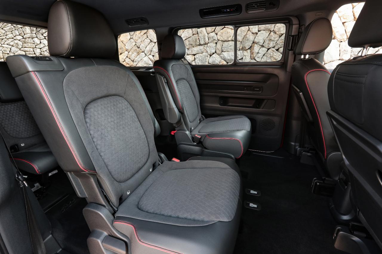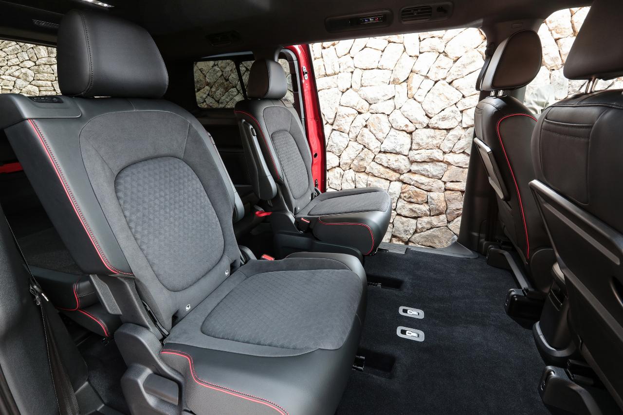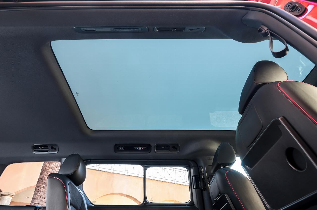 Innen signalisieren ein schwarzer Dachhimmel und Komfortsitze in Rautenmuster mit roten Kontrastnähten, dass dies kein normaler ID Buzz ist. Wie die anderen Elektrobusse aus Hannover kann der GTX mit fünf, sechs oder sieben Sitzplätzen bestellt werden. Als Sechssitzer hat er drei Reihen zu zwei Einzelsitzen. Ein Reminiszenz an den berühmten, üppig verglasten Samba-Bus ist das Panorama-Glasdach, das für den ID Buzz mit langem Radstand erhältlich ist. Es lässt sich gegen Sonne und neuartige Blicke auf Knopfdruck verdunkeln.