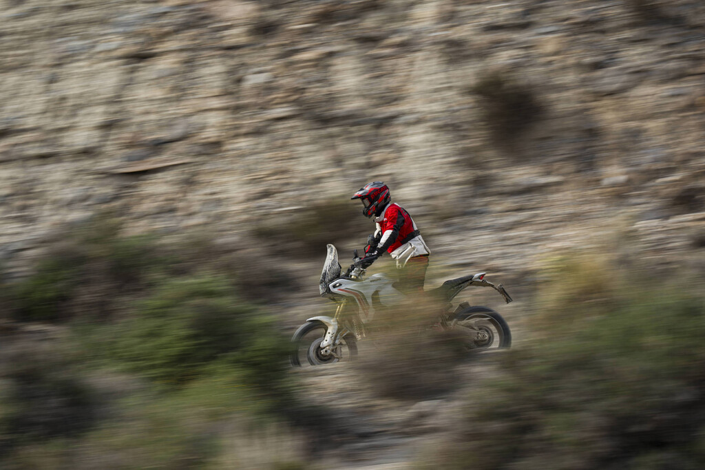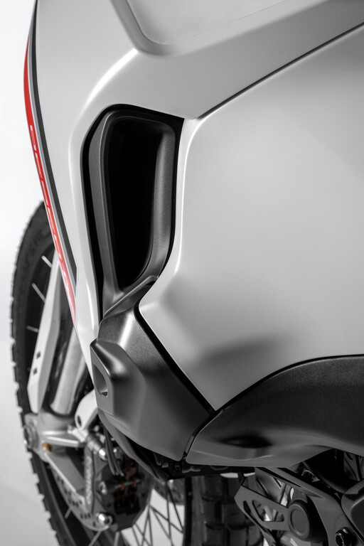 Der vordere Kotflügel ist im Vergleich zum Vorgängermodell höher positioniert. Dadurch entsteht mehr Abstand zum Reifen, sodass Schlamm und Schmutz im anspruchsvollen Gelände besser passieren können, ohne sich festzusetzen oder das Vorderrad zu blockieren. Einen Lenkungsdämpfer hat die Desert X ebenfalls.