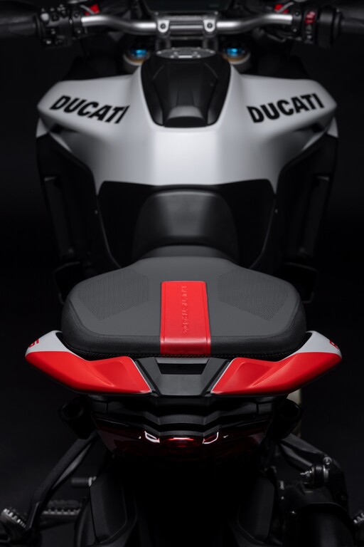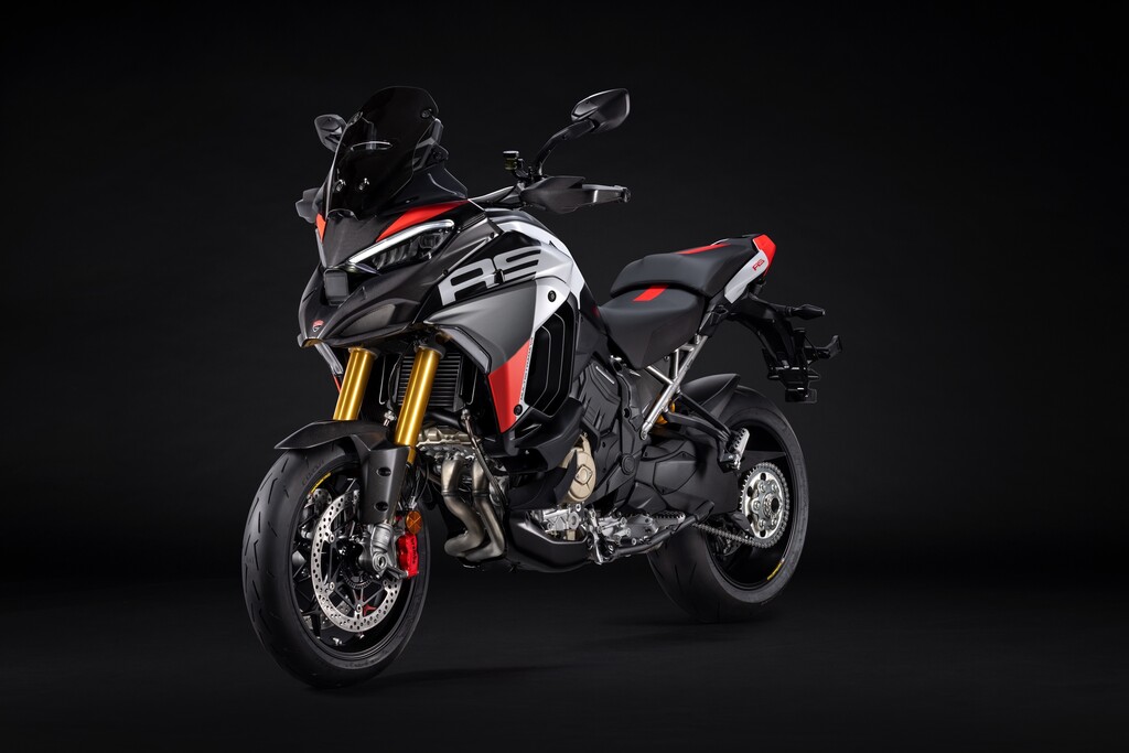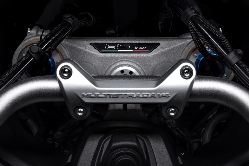 Die Multistrada V4 RS verfügt serienmäßig über das aus dem Moto GP entlehnte Elektronikpaket Ducati Vehicle Observer (DVO) mit einem Algorithmus, der 70 Sensoren simuliert. Das Öhlins-Fahrwerk verfügt über eine geänderte Regelstrategie und das Hinterrad bekommt eine 280 Millimeter große Bremsscheibe. Der Titan-Heckrahmen kann nun auch ein Topcase aufnehmen. Frontkotflügel, Handprotektoren, Hitzeschilde und Front-Schnabel bestehen aus Carbon. Die Schmiederäder, eine leichte Lithiumionen-Batterie und eine speziell für dieses Modell entwickelte Verkleidung aus Technopolymer senken das Gewicht gegenüber der Multistrada Pikes Peak um zwei Kilogramm. Die fortlaufende Seriennummer ist auf einer schwarz eloxierten Aluminiumplatte an der Gabelbrücke angebracht und mit der italienischen Flagge verziert. Das Display begrüßt den Fahrer mit einer speziellen Animation.