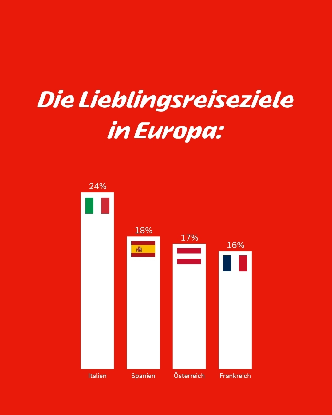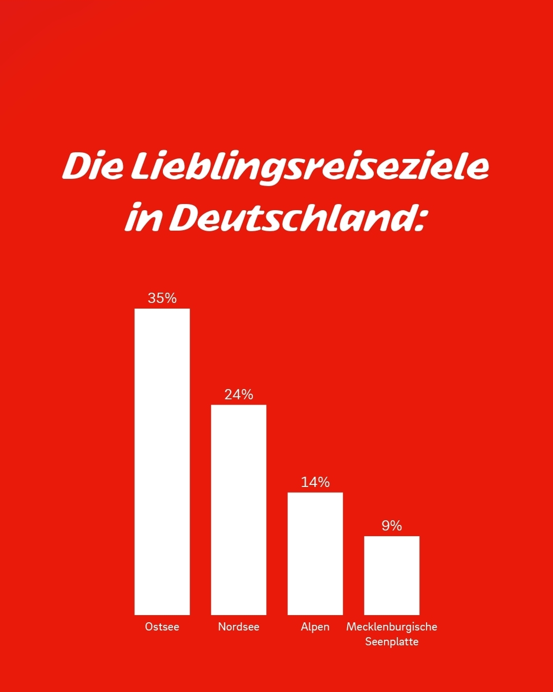Unter denjenigen, die eine oder mehrere Reisen planen, verbringen 39 Prozent ihren Urlaub innerhalb Deutschlands, 61 Prozent im europäischen Ausland und zwölf Prozent außerhalb von Europa. Beliebteste europäische Urlaubsländer sind diesen Sommer Italien (24 %), Spanien (18 %), Österreich (17 %) und Frankreich (16 %). Wer in Deutschland bleibt, legt sich am liebsten an die Strände von Ostsee (35 %) oder Nordsee (24 %) oder fährt in die Alpen (14 %) sowie an die Mecklenburgische Seenplatte (9 %).