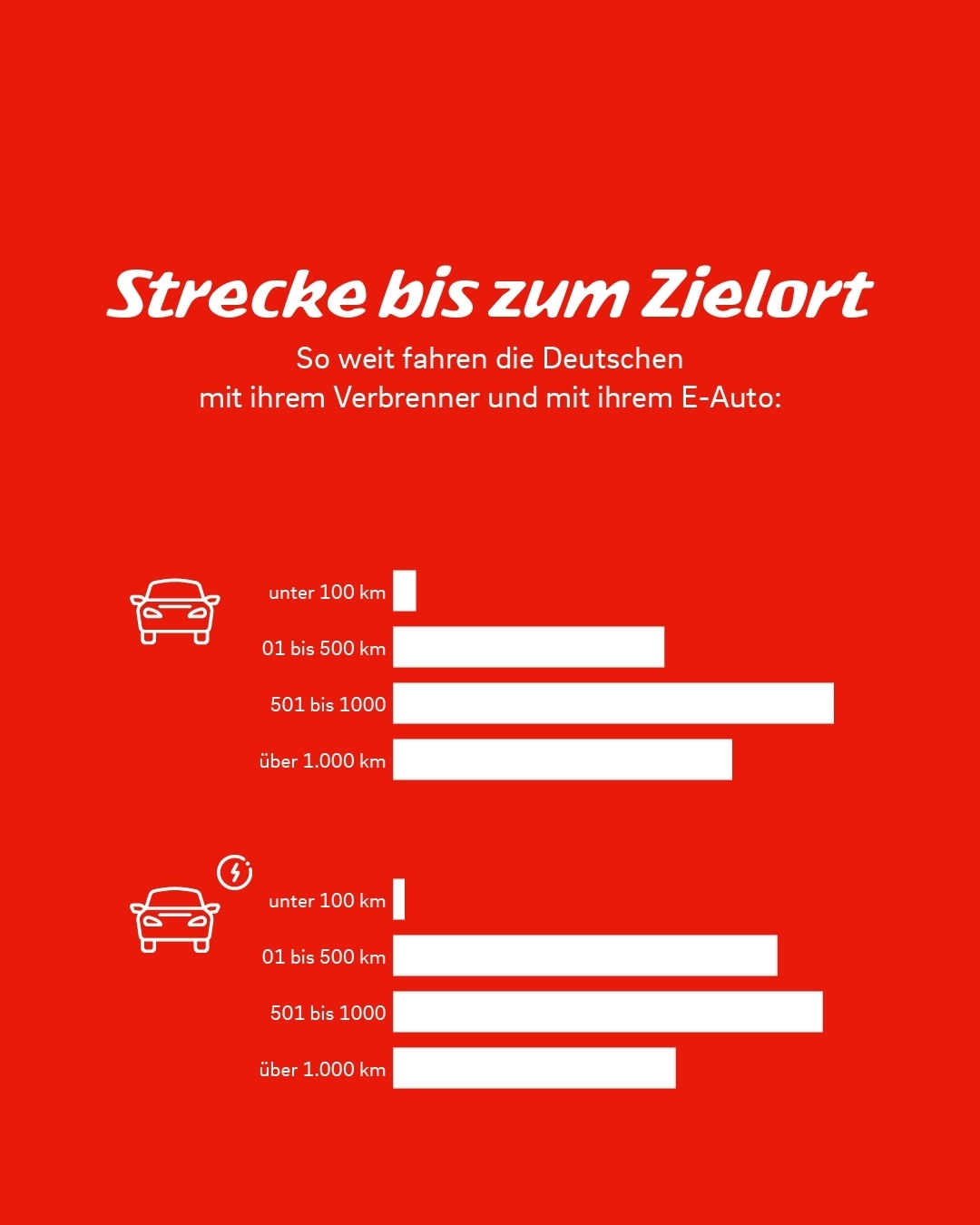 Ob E-Auto oder Verbrenner, bei der Fahrtlänge gibt es keine großen Unterschiede mehr: Rund 40 Prozent der Autoreisenden, und damit der Großteil, legen zwischen 500 und 1000 Kilometer bis zum Urlaubsort zurück – unabhängig davon, ob sie mit dem Verbrenner- oder dem E-Auto unterwegs sind. Eine Strecke von mehr als 1000 Kilometer planen immerhin ein Viertel der Besitzer von Elektroautos und 30 Prozent der Verbrenner-Fahrer. Wer auf ein E-Auto setzt, schränkt sich in Sachen Reiseziele also demnach nicht ein, stellt Eon fest.