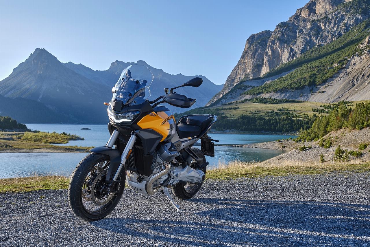 Mit dem Motor der V100 Mandello belebt Moto Guzzi einen alten Modellnamen wieder und stellt auf der Mailänder EICMA (–12.11.) die neue Stelvio vor. Die 115 PS (85 kW) starke 1,0-Liter-Reisenduro nimmt für sich in Anspruch, die einzige mit Kardanantrieb und elektrisch verstellbarem Windschild in ihrer Klasse zu sein. Ebenfalls mit an Bord ist Kurvenlicht. Die fünf Fahrmodie umfassen auch eine Offroad-Einstellung. Zudem bietet die Stelvio mit dem optionalem Radarpaket eine adaptive Geschwindigkeitsregelanlage, einen Kollisions- und einen Toter-Winkel-Warner. Erhältlich sein soll die neue Motoi Guzzi ab Februar wahlweise in Gelb oder Schwarz. Ein Preis wurde noch nicht genannt. (aum)