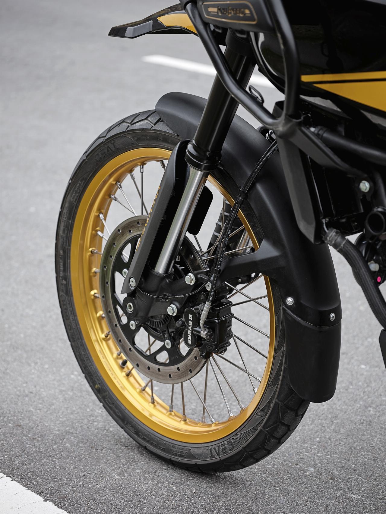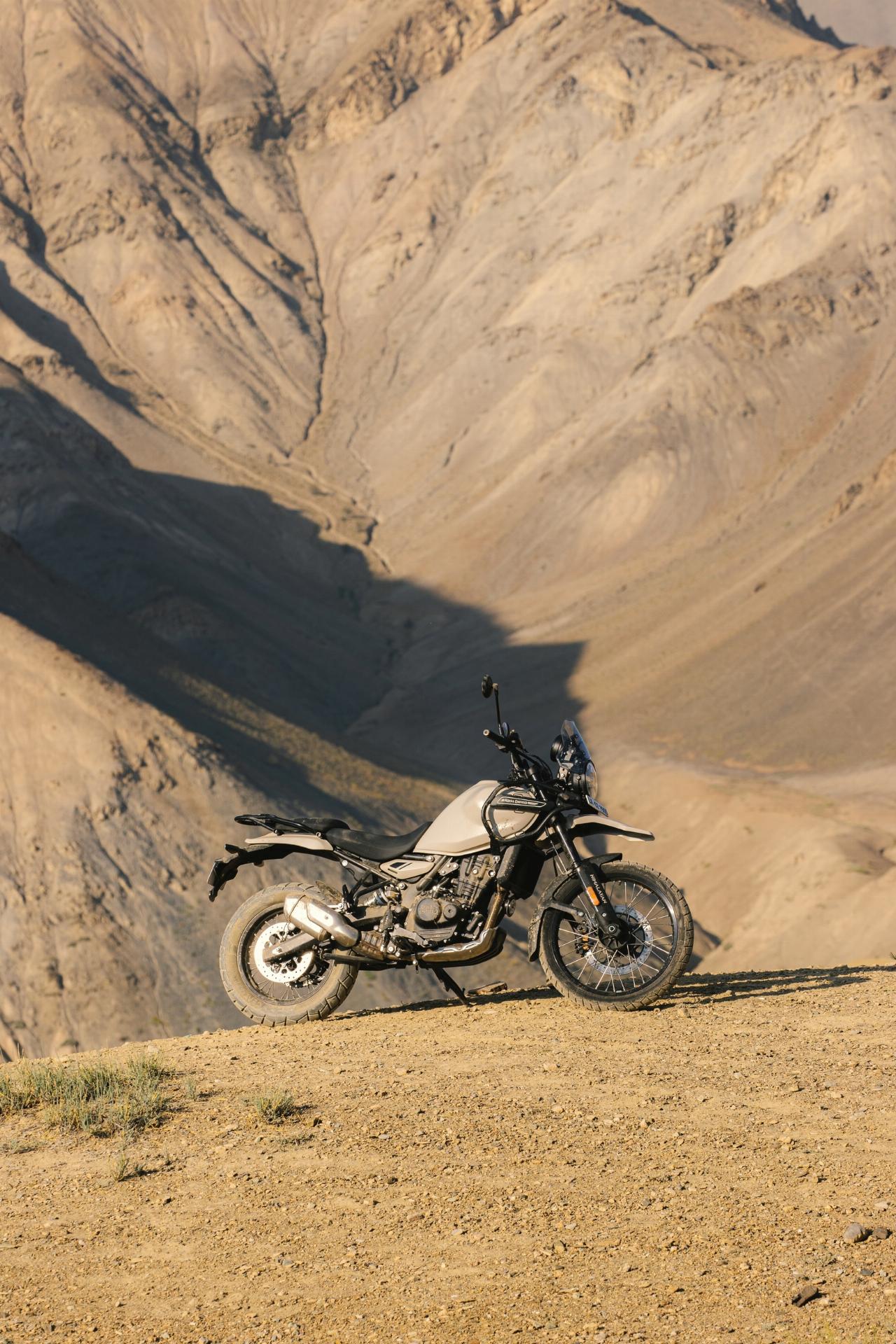 Die Enduro zeigt sich deutlich moderner gezeichnet als die bekannte Himalayan 400, trägt aber ebenfalls die typischen Tankschutzbügel, die auch als Taschenhalter dienen. Vorne rollt die neue Enfield auf einem 21-Zoll-Rad, hinten kommt eine 17-Zoll-Felge zum Einsatz. Der Federweg beträgt hüben wie drüben 20 Zentimeter, das Gewicht fahrfertig 196 Kilogramm. Die Standardsitzhöhe wird mit 82,5 Zentimetern angegeben, der Tank fasst 17 Liter. (aum)