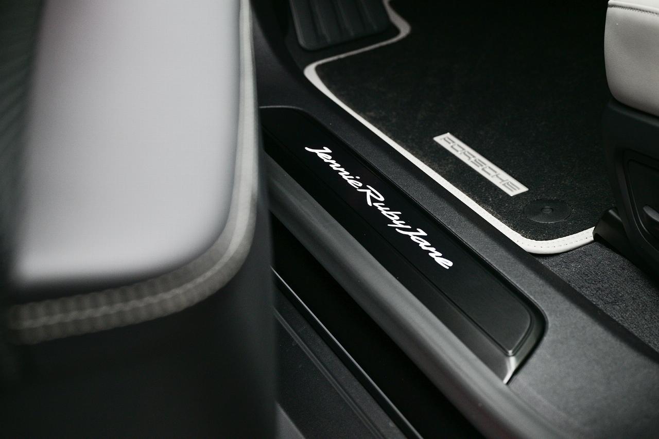 In den vorderen Türeinstiegsleisten steht der beleuchtete Schriftzug „Jennie Ruby Jane“, in den hinteren ihr Spitzname „NiNi“. Auf Kims Wunsch hin wurde dabei die Porsche-Typographie der aktuellen 911er-Generation verwendet. Der Logo-Projektor in den vorderen Türen wirft die Wolken auf den Boden neben dem Fahrzeug. Auf den Radnabendeckeln stehen der Name der Künstlerin sowie „Sonderwunsch“.