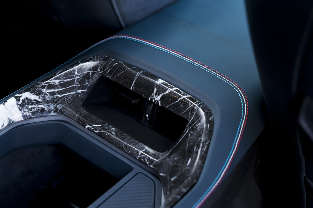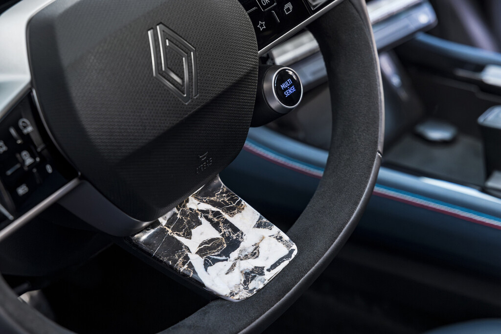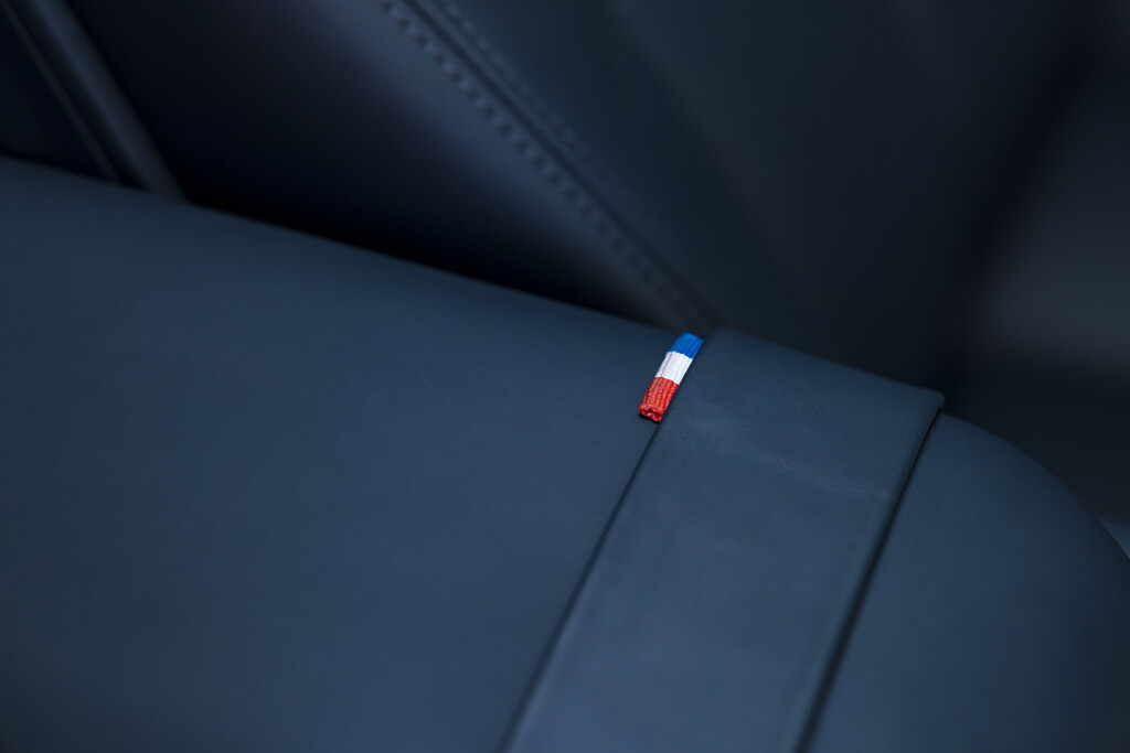 Im Innenraum findet sich an einigen Stellen schwarzer Marmor mit weißen Adern, der in den Pyrenäen abgebaut wird, und dunkles Buchenholz mit Intarsienverzierung. Das Leder stammt aus ausgewählten Reststücken und wurde in speziellen Farben neu verarbeitet, während die blauen Ziernähte der offiziellen Farbpalette der Republik entsprechen. Die Kopfstützen sind mit einer fein gearbeiteten Lasergravur des französischen Wappens versehen: eine Pelta mit Liktorenbündel und Eichen- und Olivenzweigen. (aum)
