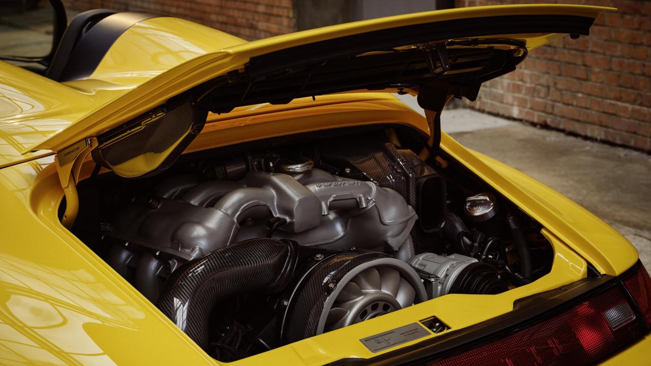 Motor, Fahrwerk, Lenkung und Bremsanlage stammen aus dem 911 Carrera RS (Typ 993). Der luftgekühlte Sechs-Zylinder-Boxer war seinerzeit der stärkste Motor von Porsche: Aus 3,8 Litern Hubraum schöpft er 300 PS (221 kW).