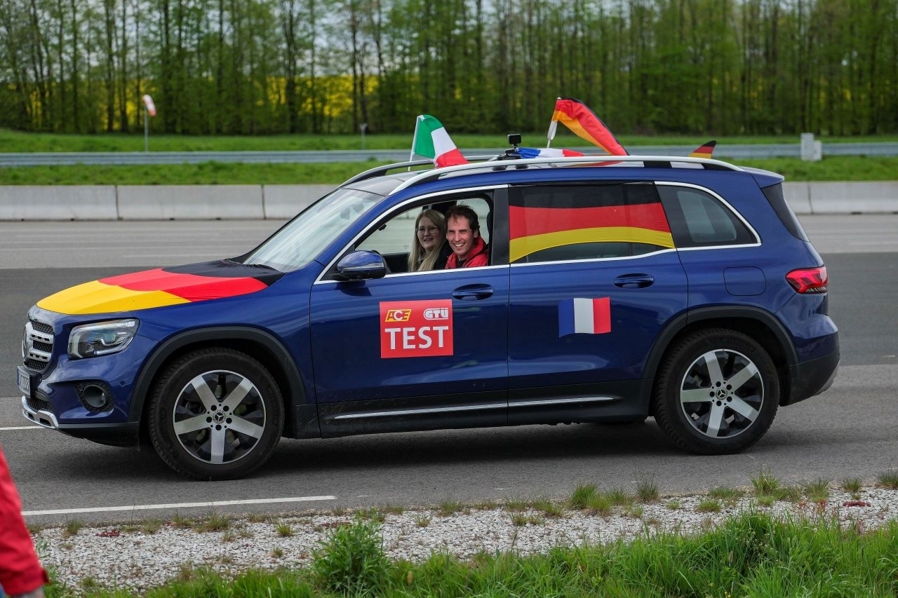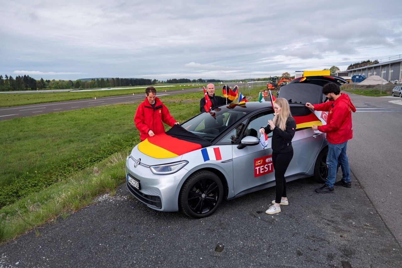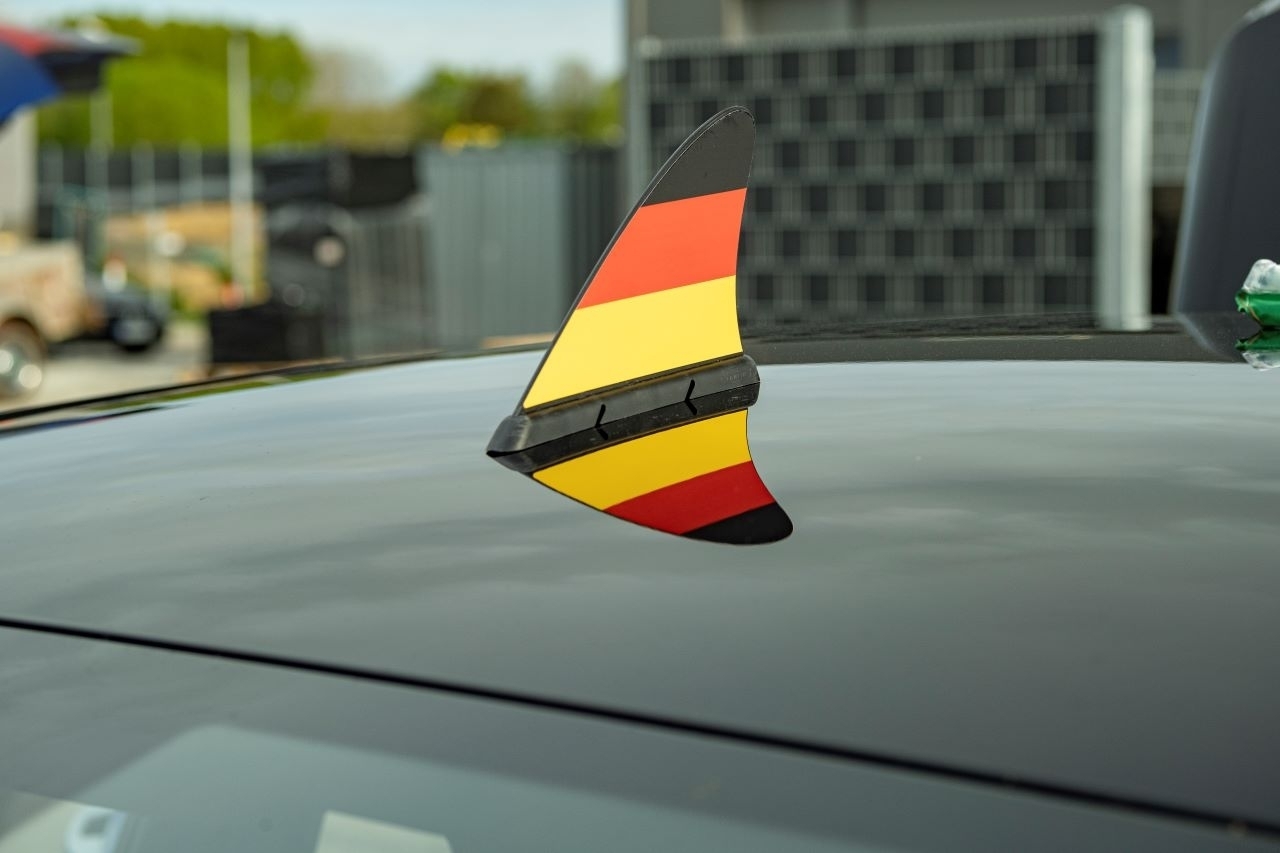 Auch für die Motorhaube sind Flaggen im Handel zu bekommen. entsprechend große Flaggen erhältlich – das Testexemplar für 24 Euro ist laut Hersteller bis zu einer Geschwindigkeit von 80 km/h geeignet. Für die Montage wird die Flagge über die Motorhaube gezogen und durch das Schließen eingeklemmt. Beim Kauf sollte unbedingt auf die richtige Größe geachtet werden. Die Motorhaube des ersten Testfahrzeugs, eines VW ID 3, ist ungewöhnlich kurz, weshalb die Flagge flatterte und bei der Fahrt für Ablenkung sorgte. Bei einem zweiten Testauto, einem Mercedes-Benz GLB, passte sie perfekt und saß fest. In der Praxis zeigt sich: Mit der richtigen Größe und einer sorgfältigen Montage hält die Fahne auf der Motorhaube auch bei hohen Geschwindigkeiten. Auf jeden Fall sollten für eine sichere Nutzung die Herstellerangaben beachtet werden.