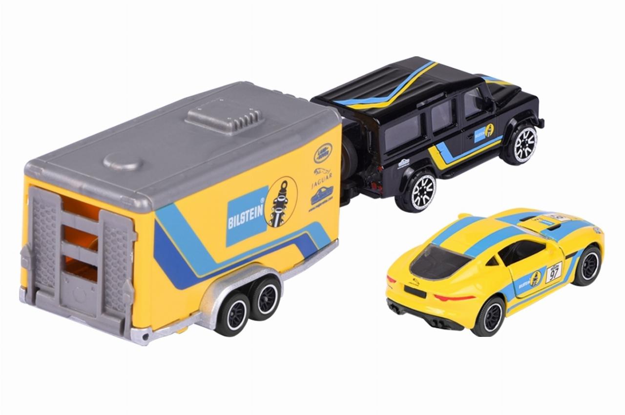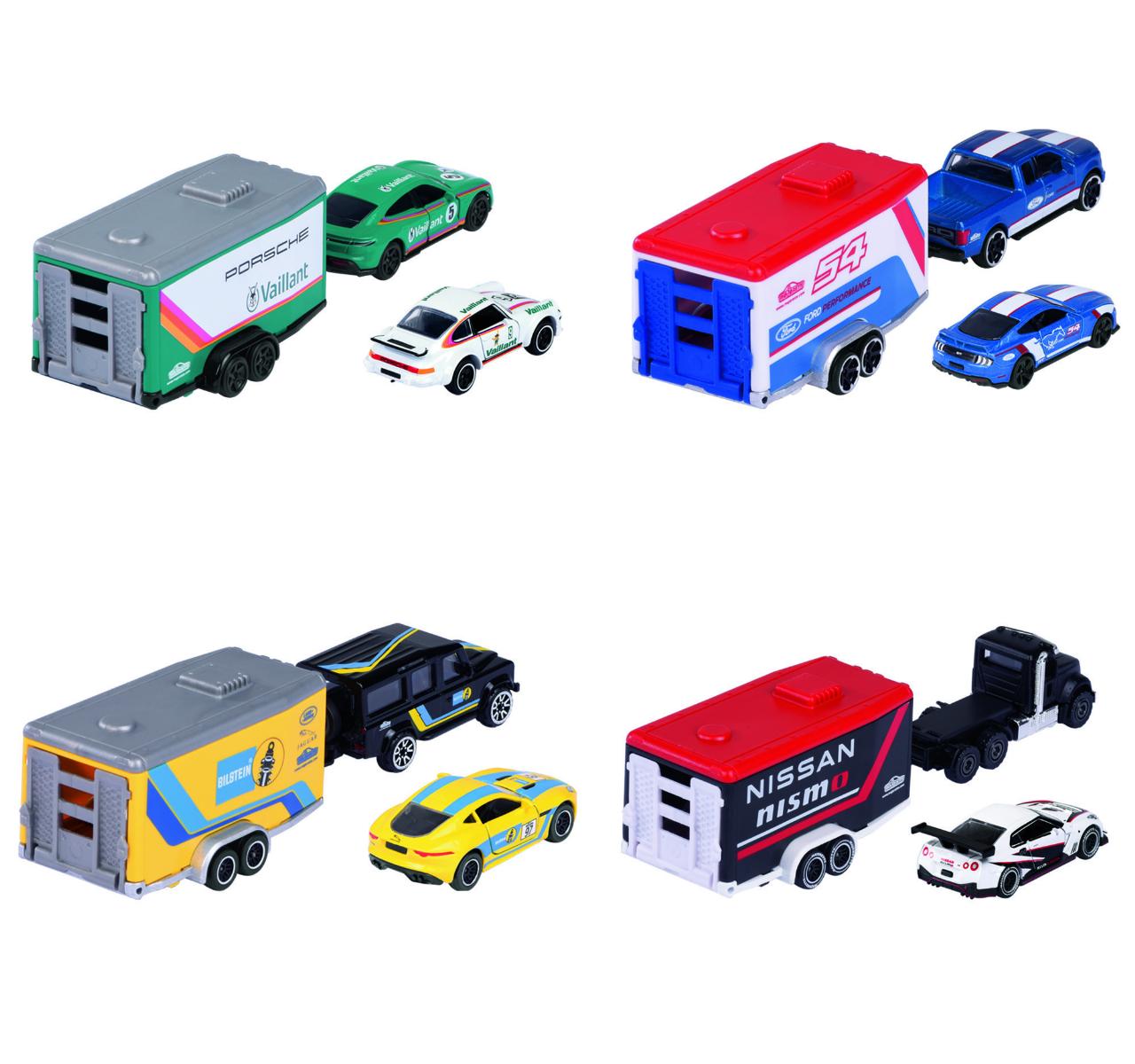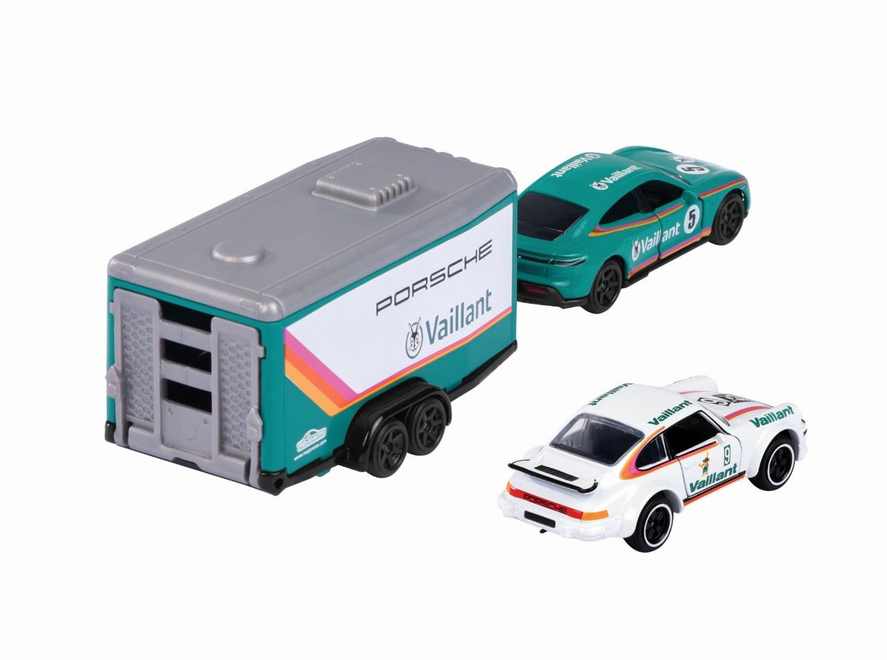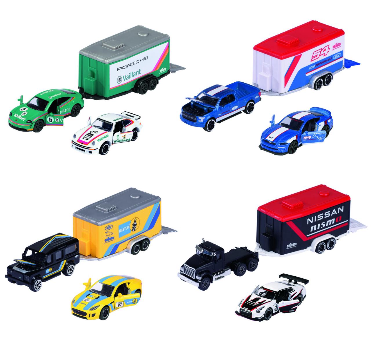 Mit dem Modellauto zur Rennstrecke: Majorette hat vier „Race Trailer“-Sets fürs Kinderzimmer ins Programm aufgenommen. Die 19 Zentimeter langen Gespanne im „Matchbox“-Maßstab bestehen jeweils aus einem Zugfahrzeug und einem aufklappbaren Transportanhänger samt Motorsportwagen. Das Porsche-Gespann im Sponsordesign von Vaillant bilden ein Taycan Turbo S und ein 934 im Renndress, beim Team Ford nimmt ein F-150 Raptor einen Mustang GT mit und ein Land Rover Defender 110 schleppt einen Jaguar F-Type im Billstein-Branding. Vierter im Bunde ist ein Mack Granite mit einem Nissan GT-R Nismo GT3 im Schlepp.