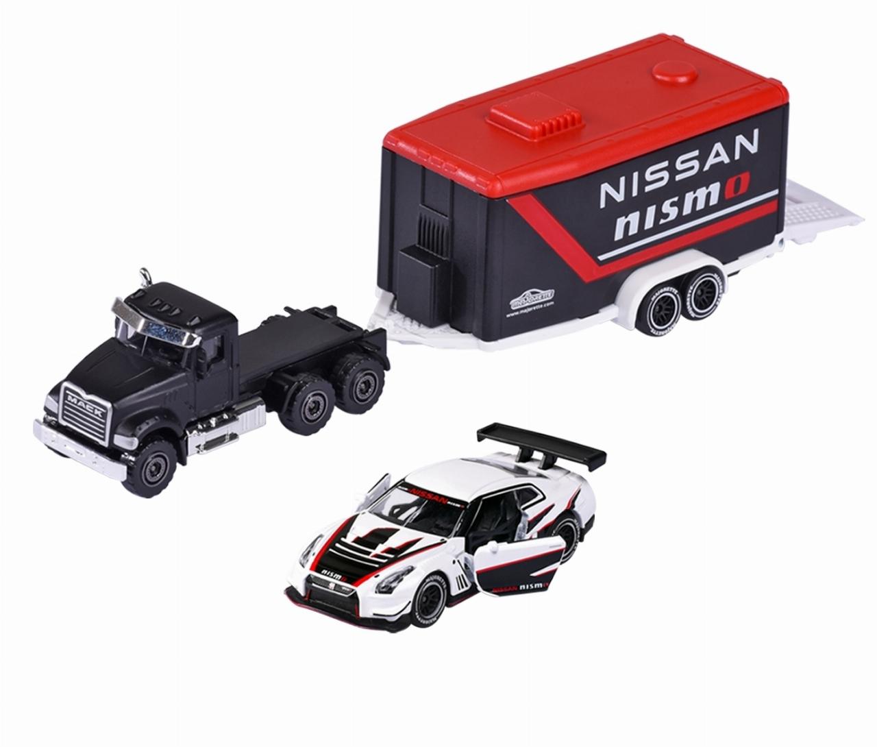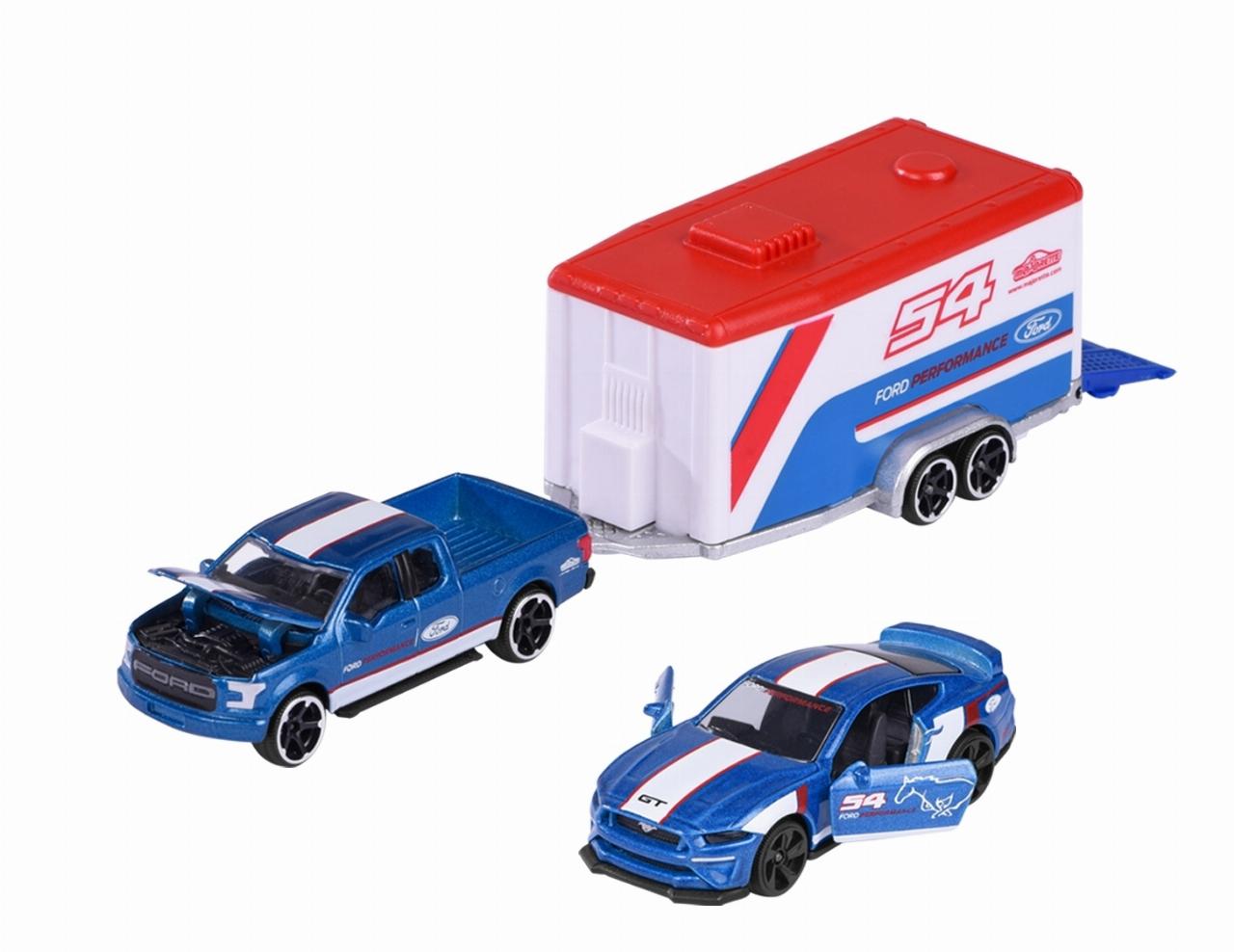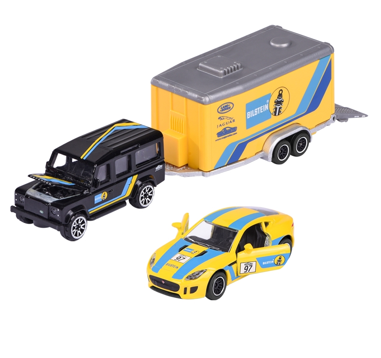 Mit dem Modellauto zur Rennstrecke: Majorette hat vier „Race Trailer“-Sets fürs Kinderzimmer ins Programm aufgenommen. Die 19 Zentimeter langen Gespanne im „Matchbox“-Maßstab bestehen jeweils aus einem Zugfahrzeug und einem aufklappbaren Transportanhänger samt Motorsportwagen. Das Porsche-Gespann im Sponsordesign von Vaillant bilden ein Taycan Turbo S und ein 934 im Renndress, beim Team Ford nimmt ein F-150 Raptor einen Mustang GT mit und ein Land Rover Defender 110 schleppt einen Jaguar F-Type im Billstein-Branding. Vierter im Bunde ist ein Mack Granite mit einem Nissan GT-R Nismo GT3 im Schlepp.
