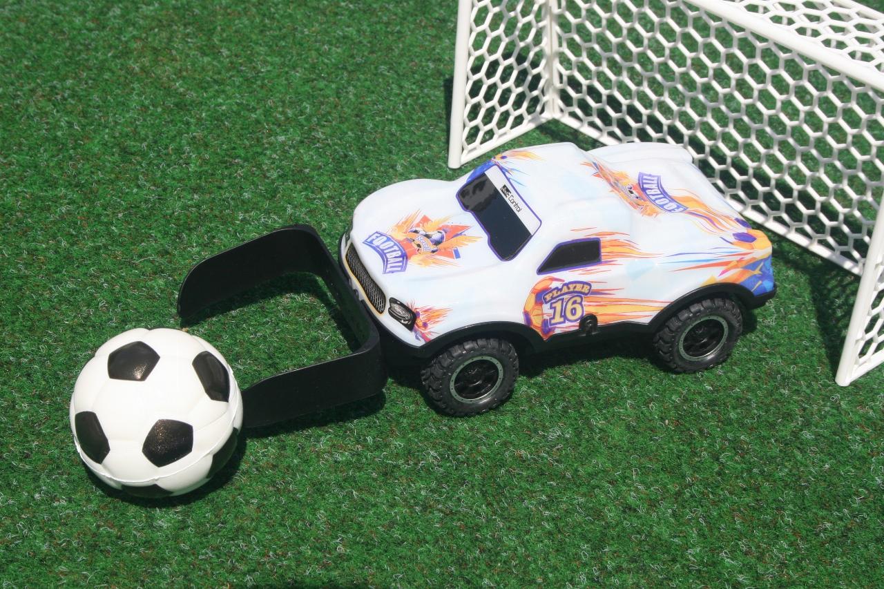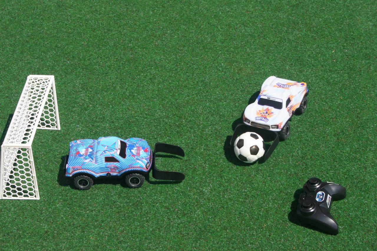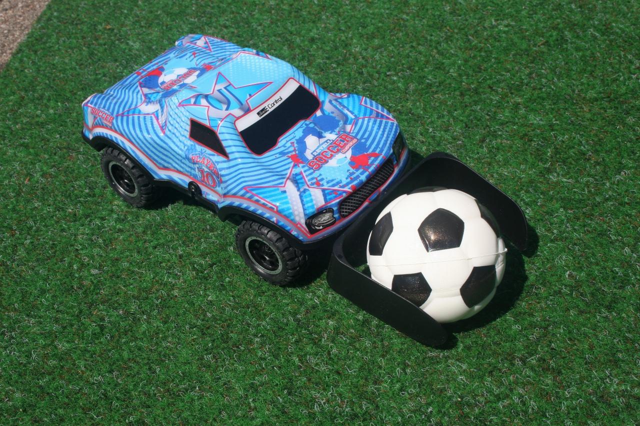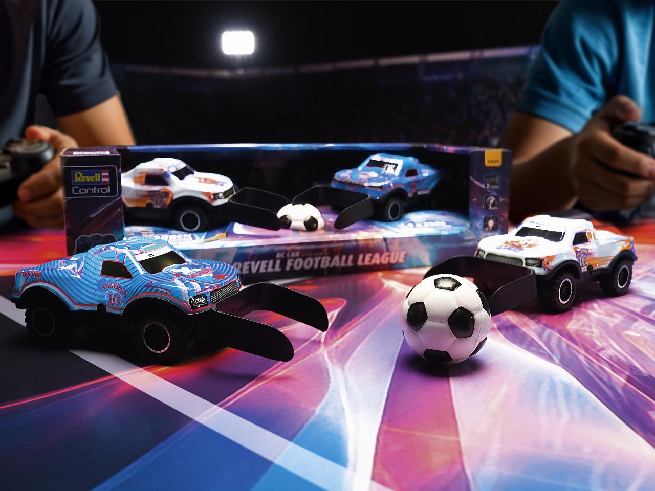 Den Maßstab der ferngesteuerten Kicker auf vier Rädern gibt Revell mit 1:22 an. Die Lexan-Karosserie leuchtet und erlaubt so auch Begegnungen unter „Flutlicht“. Der softe Fußball hat einen Durchmesser von sechs Zentimetern. Die dem Set beigelegten beiden Plastiktore sind 22 Zentimeter breit, zwölf Zentimeter hoch und sieben Zentimeter tief. Zudem gibt es noch einen Stickerbogen mit neun Nationalitäten-Aufklebern und einige weiteren Fußballmotiven zur Individualisierung der beiden in Weiß und in Bau gehaltenen Autos. Bewegt werden sie jeweils über eine Fernsteuerung mit zwei Joysticks für vor- und rückwärts sowie links und rechts. Benötigt werden zusätzlich insgesamt zehn AA-Batterien.