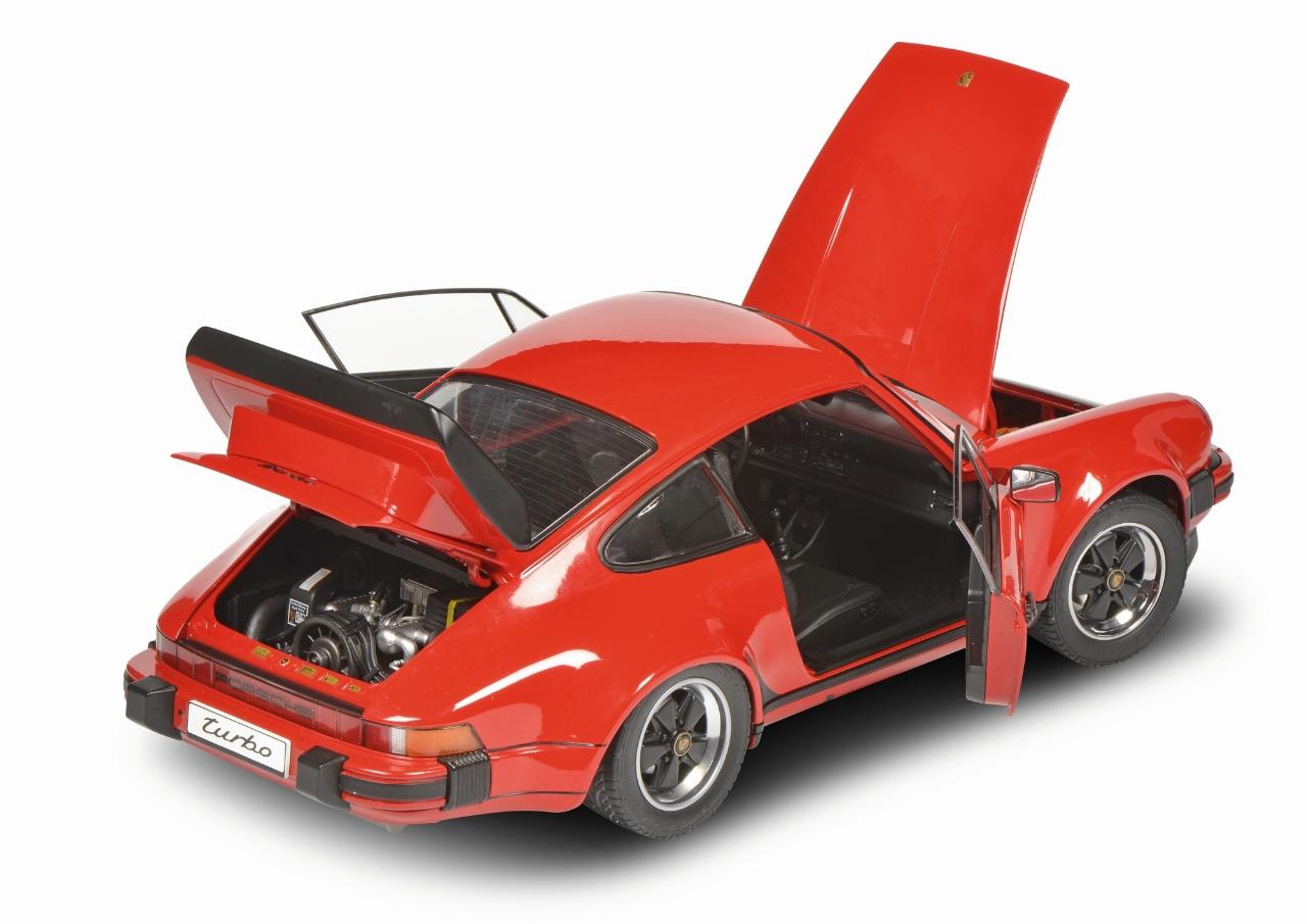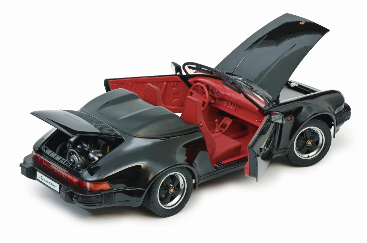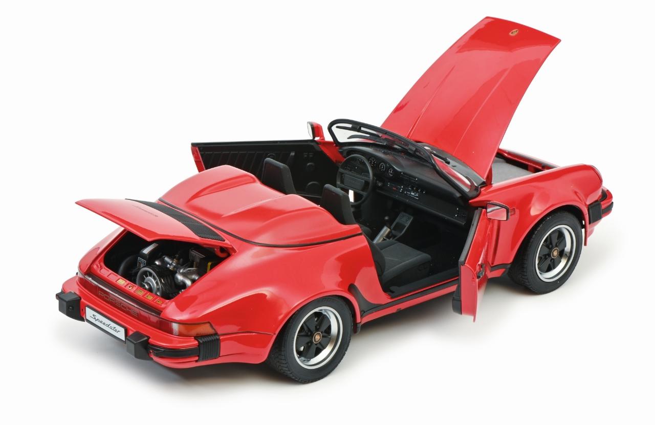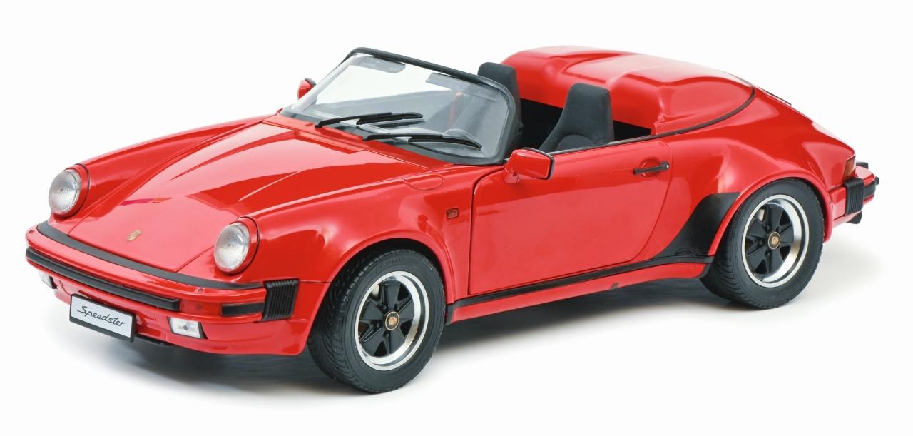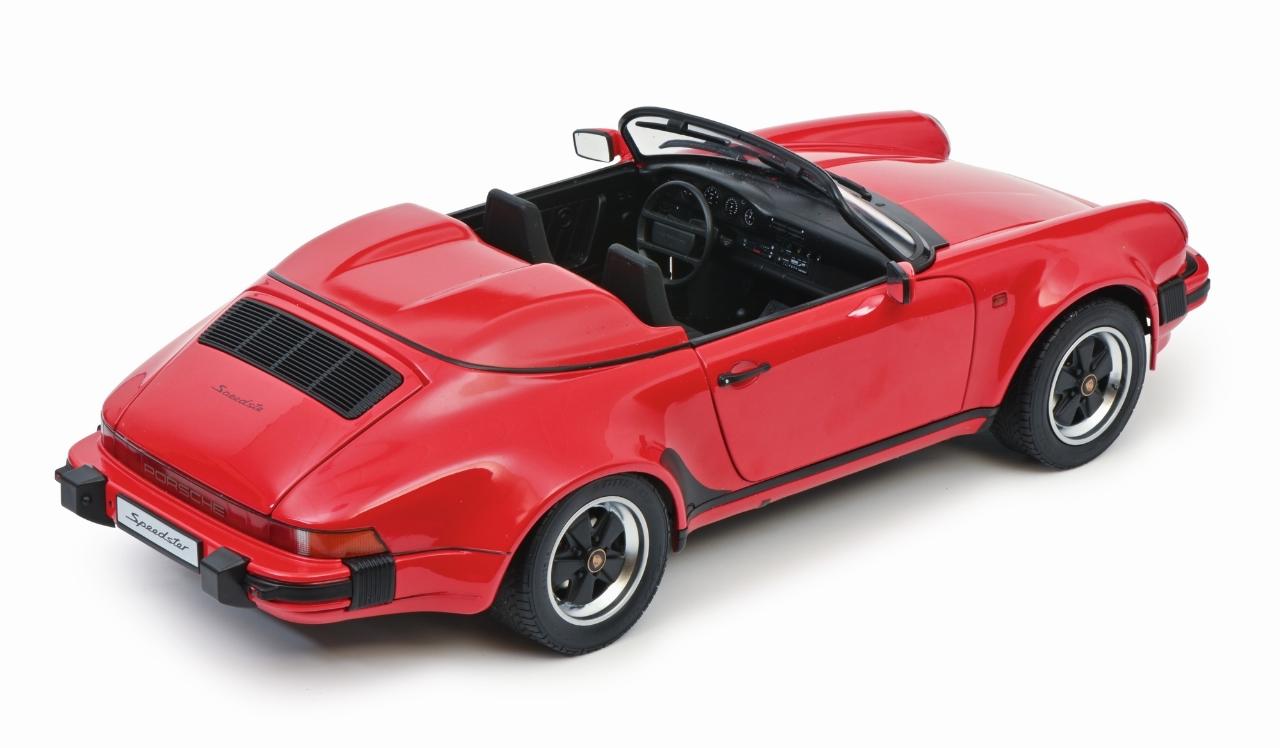 Basierend auf dem 3,2-Liter-Carrera-Cabrio hatte Porsche auf der IAA 1987 auch einen puristischen Speedster mit verkleinerter Windschutzscheibe und Notverdeck vorgestellt. Die Serienversion auf der breiten Turbo-Karosserie erschien dann zum Modelljahr 1989 mit dem Sechszylinder-Boxermotor des 911 Carrera. Vom Speedster entstanden 1680 Stück. Gut erhaltene Exemplare werden mit bis zum Vierfachen des damaligen Neupreises von 112.000 D-Mark gehandelt. Den Schuco-Speedster gibt es wahlweise in Rot oder Schwarz.