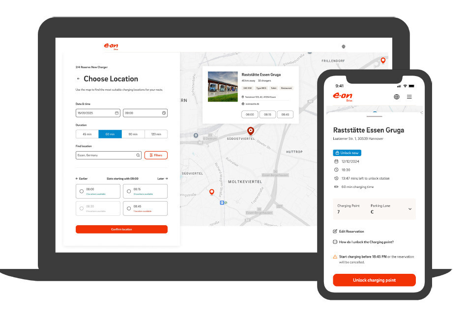 Eon hat ein neues Reservierungssystem für E-Lkw-Ladestationen entwickelt. Durch die Plattform können Ladestopps geplant und Ladepunkte im Voraus gebucht werden. Die Reservierungen können jederzeit angepasst werden, sollten sich die Route oder die Ankunftszeit kurzfristig ändern. „Durch das vorausschauende Buchen von Ladepunkten stellen wir sicher, dass elektrische Lkw zukünftig nicht auf eine freie Ladesäule warten müssen – gleichzeitig ermöglichen wir es Fahrerinnen und Fahrern, während ihrer gesetzlichen Ruhepause laden zu können“, sagt Arjan van der Eijk, Geschäftsführer bei Eon Drive Infrastructure.