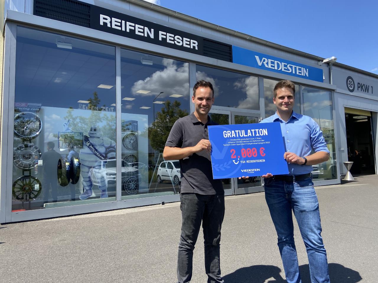 Die meisten seiner Kunden konnte Reifen Feser aus Schweinfurt zur Teilnahme bewegen. Der langjährige Vredestein-Partner hatte bei der vorherigen Runde der Aktion noch den dritten Platz belegt. Geschäftsführer Tobias Gerstner nahm zur Belohnung einen Reisegutschein über 2000 Euro entgegen. Die Betriebe auf den Plätzen zwei und drei erhielten Gutscheine über 1500 beziehungsweise 750 Euro. Die Händler auf den Plätzen vier bis zehn bekamen einen 100-Euro-Einkaufsgutschein. (aum/av)