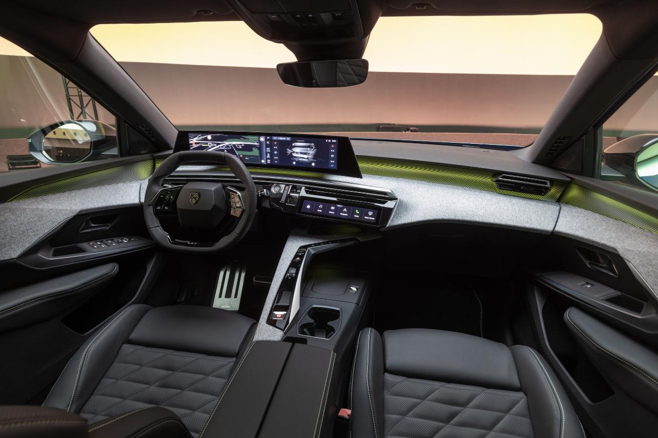 Die Materialien des Innenraums wirken hochwertig und modern. Die Flächen an der Armaturentafel und der hohen Mittelkonsole sind mit grauem Stoff bezogen. Elemente aus Aluminium werden in acht verschiedenen Farben angestrahlt.