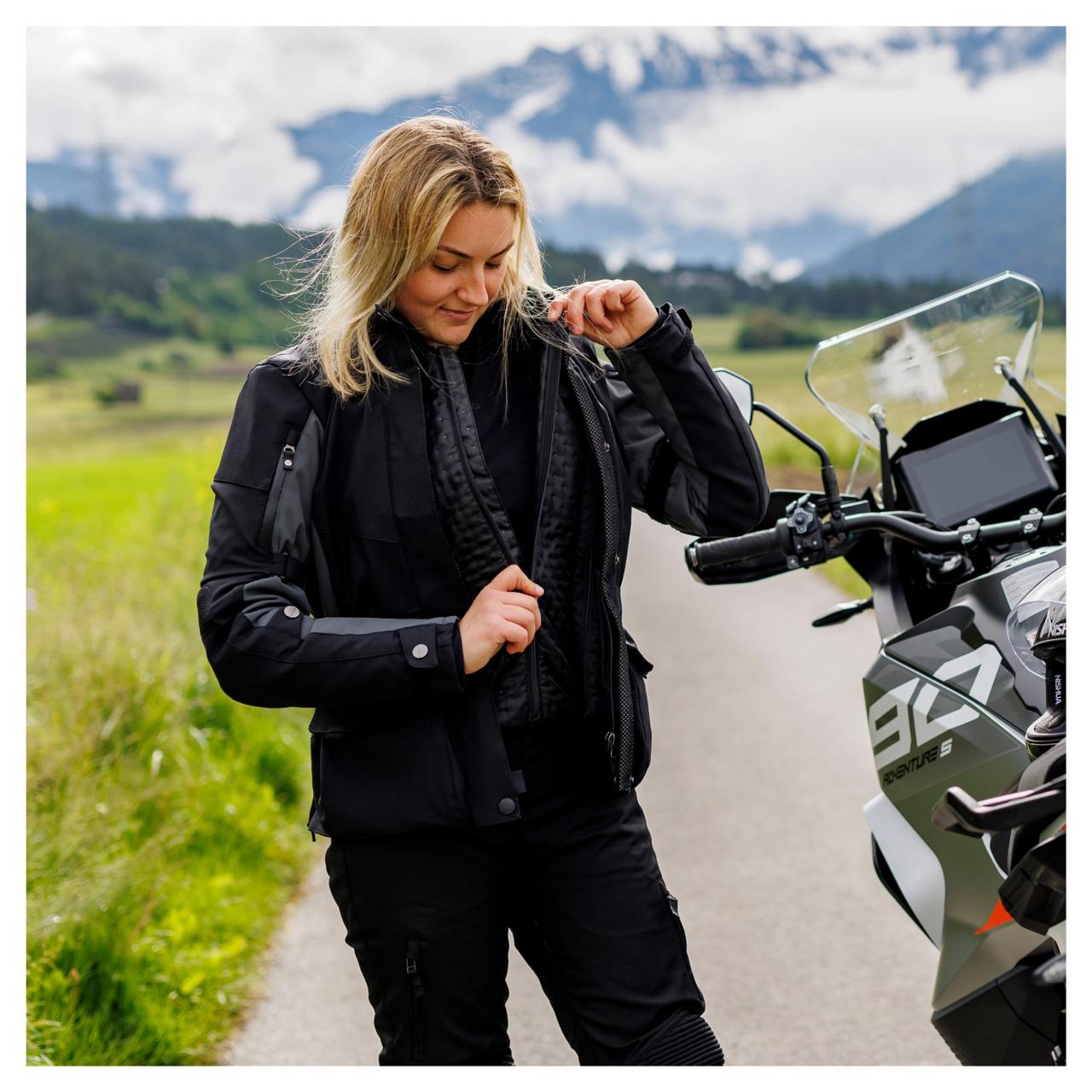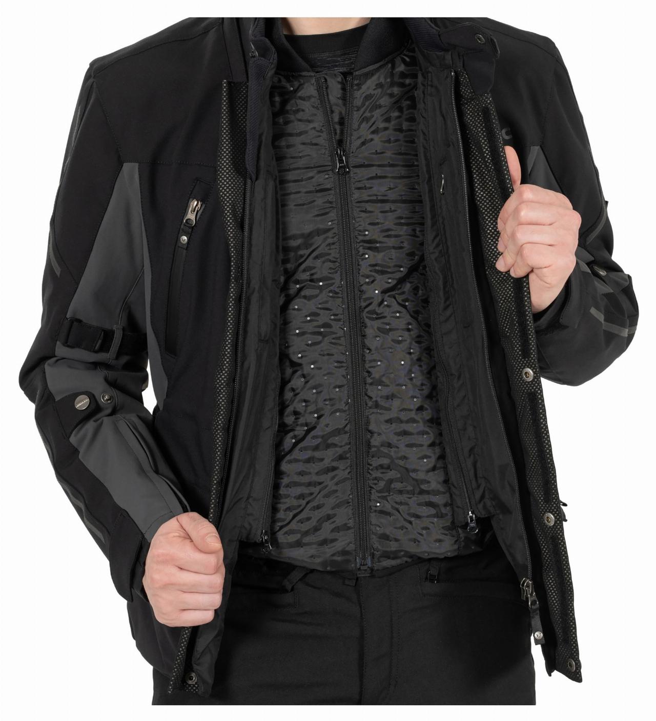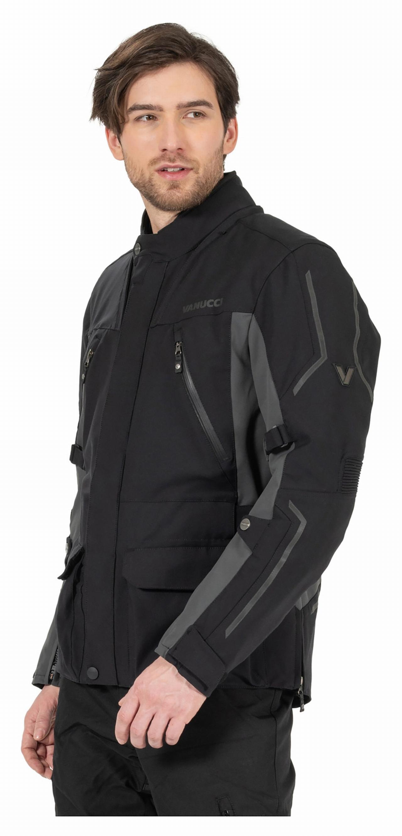 Zwei wasserdichte Außentaschen und zwei Dokumententaschen gehören ebenso zur Ausstattung wie Protektoren an Schultern und – höhenverstellbar – Ellenbogen. Für zusätzliche Sicherheit sorgt das Reflexmaterial. Ab Größe 60 verfügt die VAJ-5 über einen Akkordeon-Stretch an den Seiten für mehr Bewegungsfreiheit.