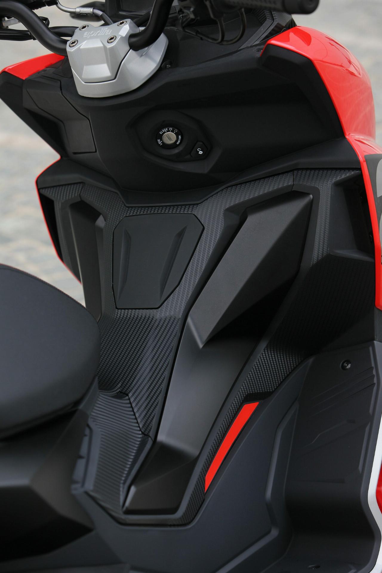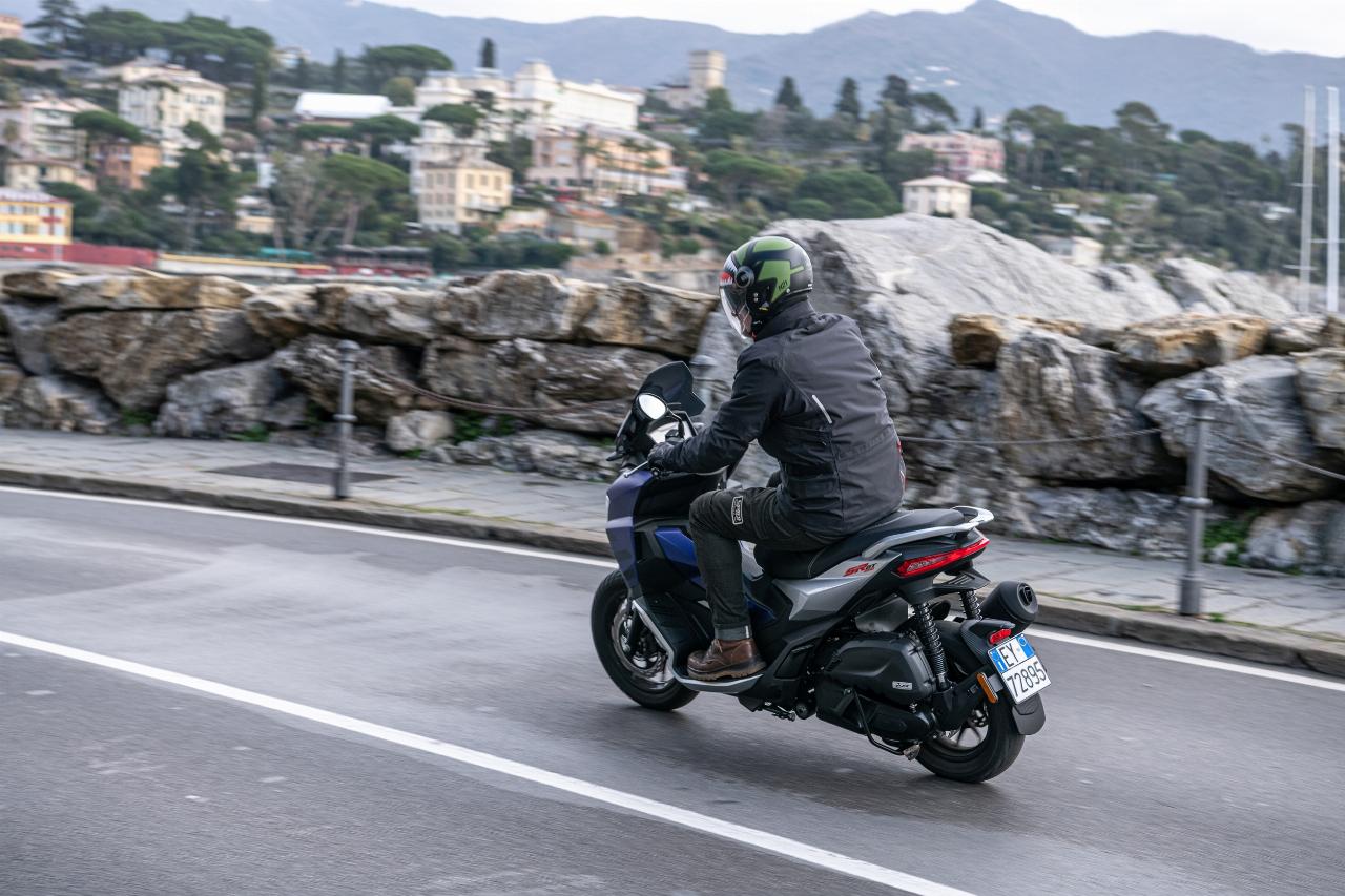 2,5 Liter auf 100 Kilometer gibt Aprilia als Verbrauch an. Das beruhigt beim Blick auf die explodierenden Treibstoffpreise. Bei der mehrstündigen Testfahrt an der ligurischen Küste flossen laut Bordrechner im Schnitt 2,9 Liter durch den Einzylinder mit abschaltbarer Start-Stopp-Automatik. Neun Liter passen in den Tank, macht 300 Kilometer Reichweite ohne Zwischenstopp. Fahrer oder Fahrerin samt Sozia oder Sozius sitzen komfortabel auf einem erfreulich festen Zwei-Personen-Polster. Die Fußrasten für Mitfahrende tarnen sich bei Solobesetzung als Teil der Verkleidung. Die Trittbretter sind ausreichend lang bis Schuhgröße 47. 1350 Millimeter Radstand und kompakte 1920 Millimeter Gesamtlänge setzen der Beinfreiheit natürliche Grenzen: Zum Ausstrecken der Gräten hinterm Beinschild reicht es bei knapp 1,80 Meter Körpergröße nur bedingt. Die Sitzhöhe misst passable 799 Millimeter
