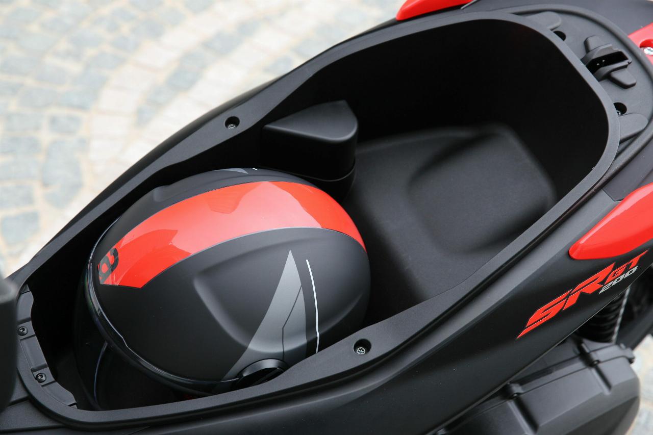 Die Höchstgeschwindigkeit gibt Aprilia mit 99 km/h an beim SR GT 125 und 114 km/h beim SR GT 200. Das reicht vollkommen, ebenso wie der Stauraum. Das geräumige 25-Liter-Staufach unterm Sitz fasst locker einen Visor-Helm plus Kleinkram. Eine Feder hält die breite Sitzbank nach dem Öffnen im 90-Grad-Winkel oben. Zum Fernentriegeln gibt es einen Knopf neben dem Zündschloss. Links in der Frontverkleidung befindet sich ein praktisches Handyfach mit Lademöglichkeit. Das LCD-Display ist tadellos ablesbar, wenn auch etwas schmucklos. Via Bluetooth und Aprilia-MIA-App lässt sich das Smartphone koppeln.