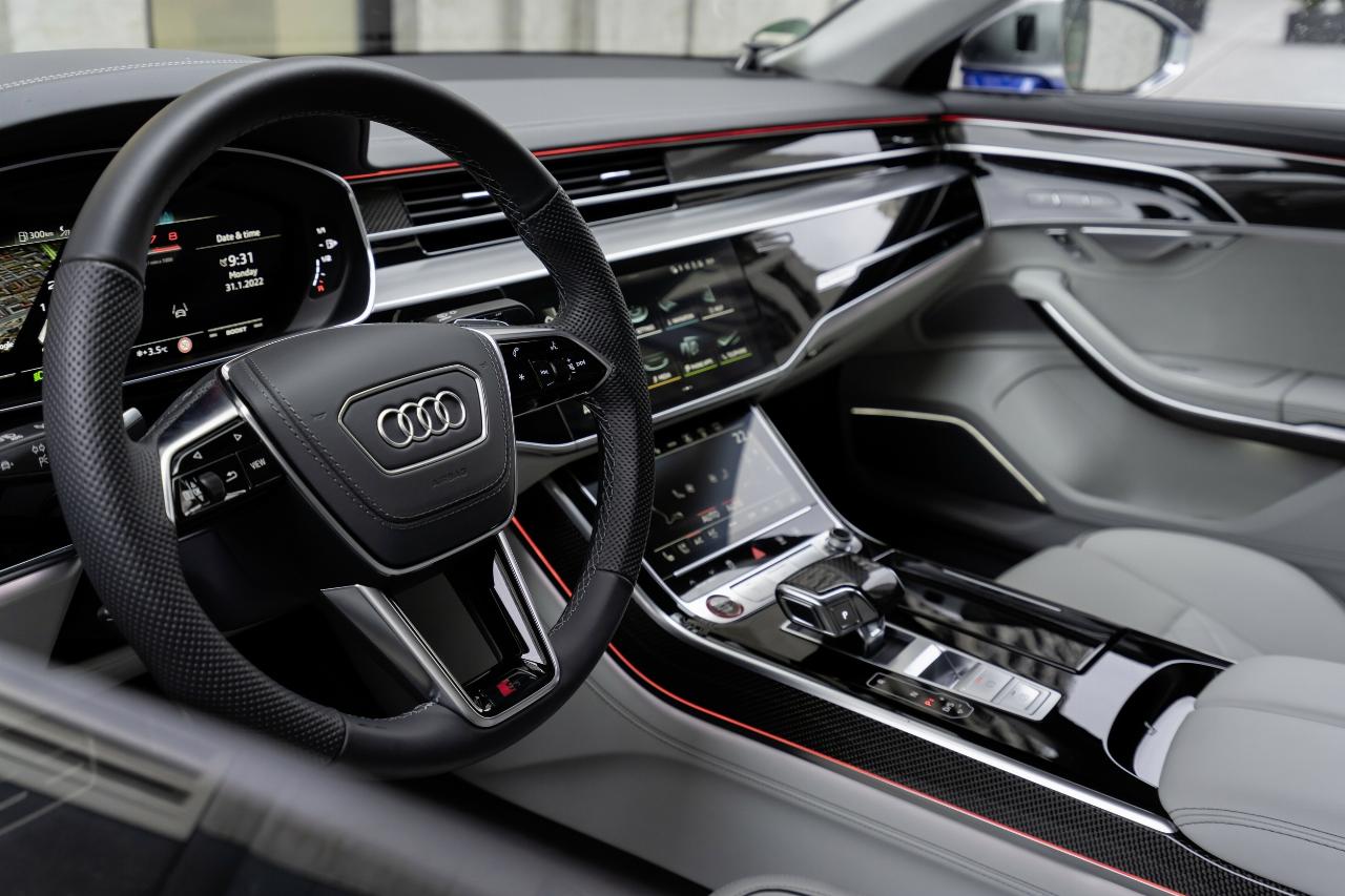 Die kühl-futuristisch Armaturentafel mit ihrer großzügigen Verglasung und den eleganten Abdeckungen der Luftausströmer ist praktisch unverändert geblieben; sie tritt inzwischen in einigen Details hinter die S-Klasse von Mercedes-Benz zurück. Dort ist das Head-up-Display größer und es gibt auf Wunsch echte Dreidimensionalität. Beim Audi gefällt uns die Balkengrafik der Instrumentierung, die Navigation funktioniert perfekt, und die Darstellung lässt sich vielfach individualisieren. Schade finden wir es allerdings, dass das eindrucksvolle Vier-Speichen-Volant des A8 im S8 einem konventionellen Drei-Speichen-Lenkrad weichen muss.