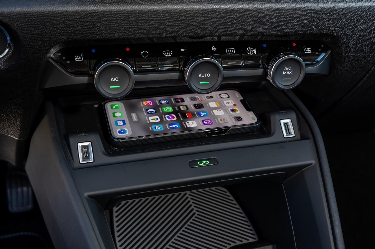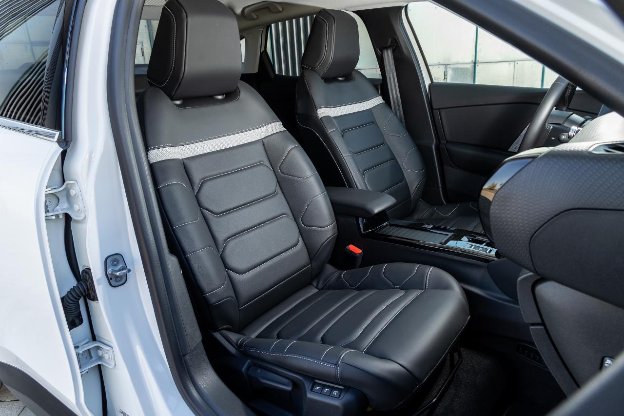Auch in Cockpit und Innenraum sind die Ähnlichkeiten augenfällig. Oberflächen und Materialien sind wegen einiger Hartplastikdetails nicht unbedingt premiumlike, aber insgesamt schnörkellos und ansprechend gestaltet. Auch Tasten und Bedienelemente sind übersichtlich und intuitiv geordnet, das Multifunktions-Lenkrad mit Leder bezogen. Immer serienmäßig ist das digitale 5,5-Zoll-Kombiinstrument sowie ein Infotainment-System mit 10-Zoll-Touchscreen, dessen Funktionslogik allerdings einer gewissen Eingewöhnung bedarf. Immerhin: Apple CarPlay und Android Auto lassen sich kabellos integrieren, das Smartphone lädt optional induktiv in der Mittelkonsole oder über eine der vier USB-C-Anschlüsse. Ein Head-Up-Display als ausfahrbare Plastikscheibe ist in den höheren Ausstattungen, eine 2-Zonen-Klimaautomatik sowie zahlreiche Fahrassistenten schon in der Basis „Feel“ Serie.