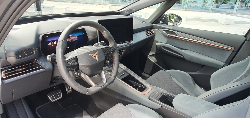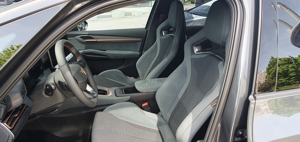 Das gilt auch für den Innenraum. Inmitten von viel Schwarz und kupferfarbenem Zierrat umgreifen einen Schalensitze vom Typ Abrahams Schoß. Im Blick: Ein überarbeitetes Lenkrad mit neuen Bedienelementen, ein knapp 13 Zoll großer Touchscreen und ein auf 10,25 Zoll gewachsener Cockpit-Bildschirm. Wirklich Wichtiges projiziert das Head-up-Display virtuell vors Auge – schwirrende Richtungspfeile für die Navigation inklusive. Das ist im Wortsinn großes Kino. Selbstverständlich wahrt der Born VZ brav Tempo, Spur und Abstand, späht in Kreuzungen und tote Winkel und wirft im Notfall den Anker. Und wer trotz aller Perfomance auch an die Umwelt denken will: In nahezu jeder Art von Cupra-Gewebe steckt ein hoher Anteil an Flachsfasern, Meeresplastik und recycelten Fischernetzen. Geblieben ist leider die Altlast der Slider. Die sind nun zwar beleuchtet, wirklich gewöhnen indes kann man sich daran nicht.