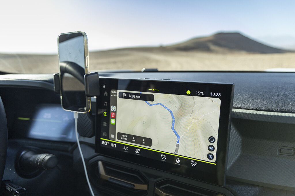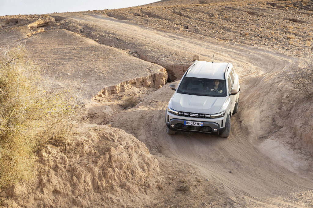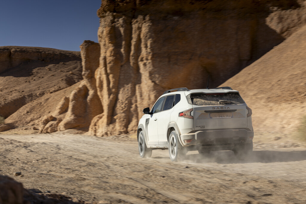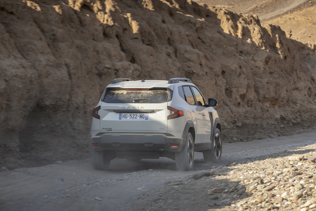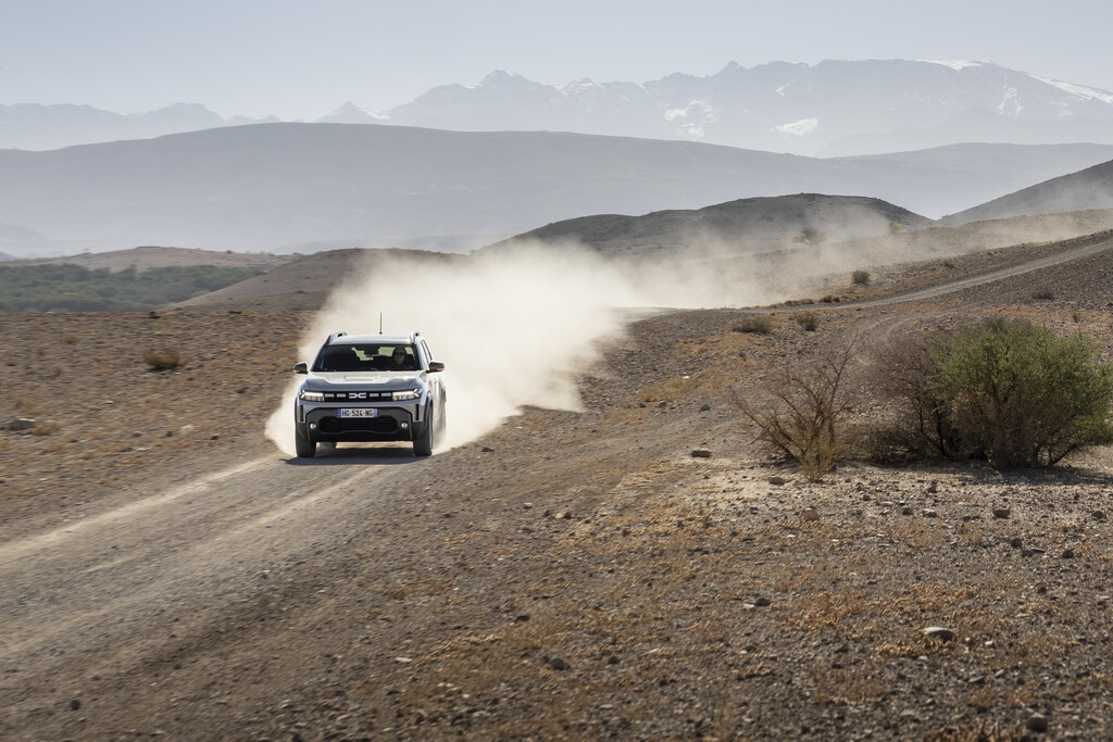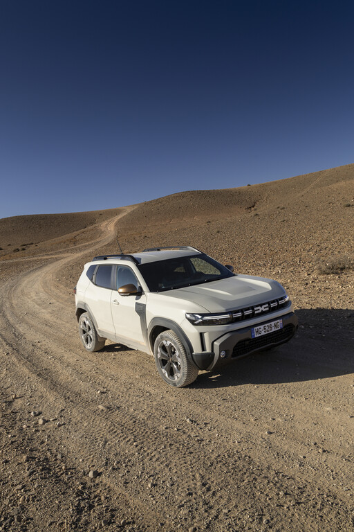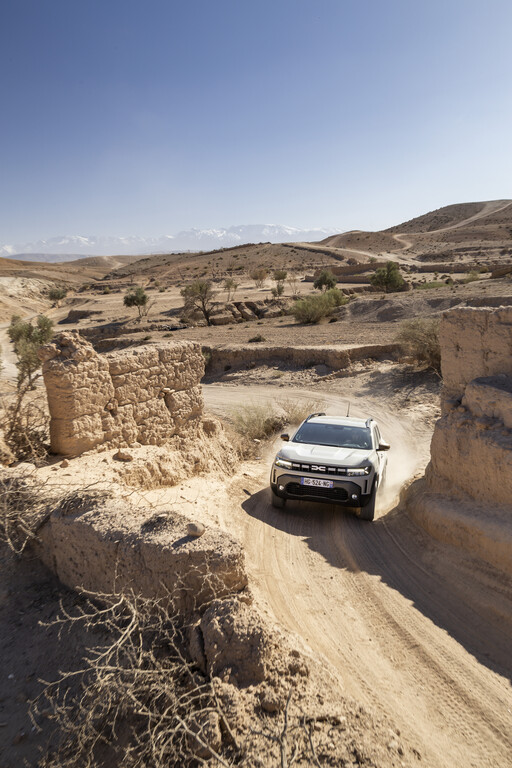Nach diesem Ausflug in die Technik in die reale Welt. Für die ersten Testfahrten wählte Dacia die alten Karawanenrouten in der herausfordernden Agafay-Wüste in der Nähe von Marakesch am Rand des Atlas-Gebirges, die dem Duster wenig Sand, dafür aber umso mehr Felsen und Geröll in den Weg stellte. Dank der Bodenfreiheit von 22 Zentimetern lässt der Dacia die meisten Hindernisse einfach unter sich und zieht unbeeindruckt von den Hindernissen nach vorne. Das Doppelkupplungsgetriebe stellt unauffällig und automatisch stets den passenden Gang bereit. Um das Gelände zu beherrschen, kann der Mensch hinter dem Lenkrad aus vier Einstellungen wählen: Bei „Auto“ greift der Allradantrieb immer dann ein, wenn die Räder zu wenig Grip haben. Bei „Eco“ ist das auch der Fall, nur wird dann besonders sparsam mit den beiden Energiequellen umgegangen. Daneben gibt es noch die Einstellungen „Snow“ – ja auch in Marokko kann es schneien – und „Mud/Sand“, wenn sich die Geröllwüste kurzfristig in einen riesigen Sandkasten verwandelt. Außerdem ist noch mit „Lock“ eine Differenzialsperre an Bord und für besonders steile Abfahrten empfiehlt sich die „Hill Descent Control“, mit der die Abfahrtgeschwindigkeit zwischen drei und 30 km/h regulieren lässt.