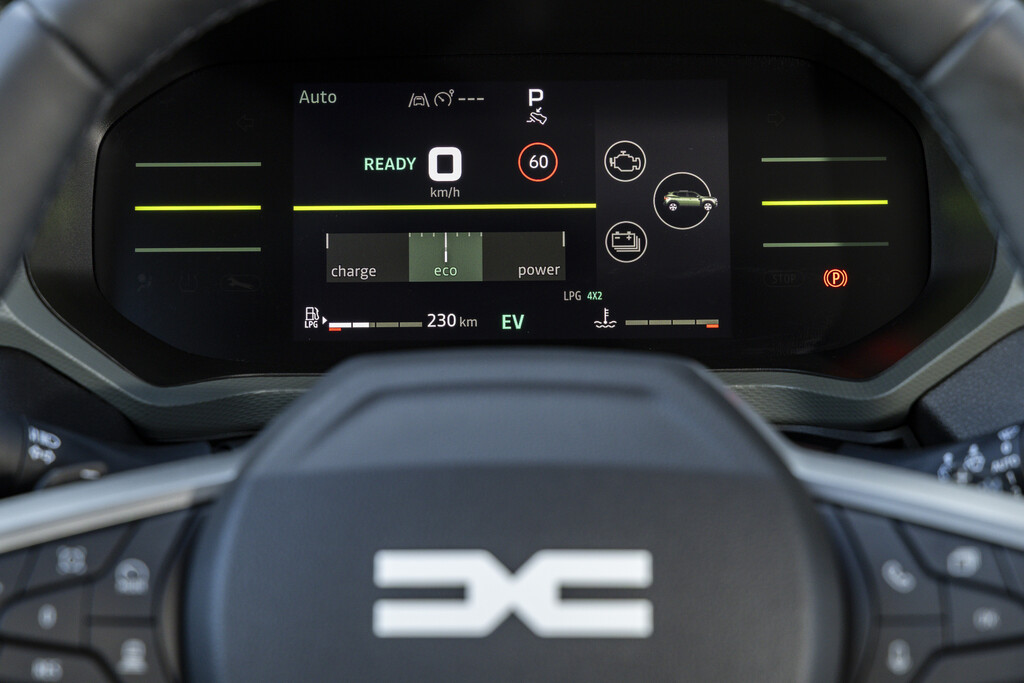 Das Ergebnis ist, wie die Dacia-Verantwortlichen nicht ohne Stolz vermelden, die bisher so noch nicht eingesetzte Kombination von Hybrid- und Autogasantrieb (LPG), wobei LPG in Deutschland einen bescheidenen Marktanteil von 0,7 Prozent erreicht – die meisten Modelle mit diesem Energieträger kommen allerdings von Dacia. Das Benzin und das Flüssiggas werden in jeweils 50 Liter fassenden Tanks gebunkert, wobei der Gastank das Reserverad verdrängt. Das Ergebnis ist, versprechen die Techniker, eine kombinierte Reichweite von bis zu 1500 Kilometern.