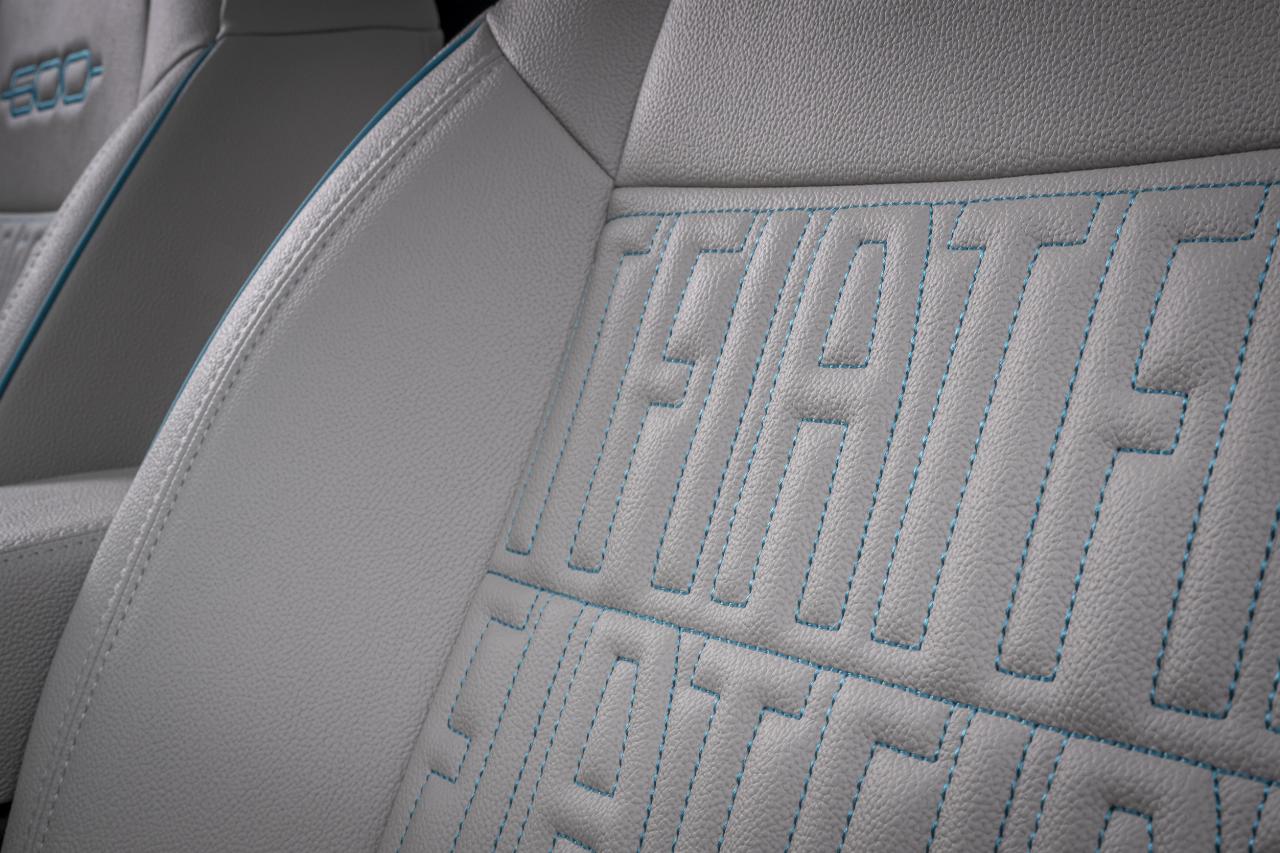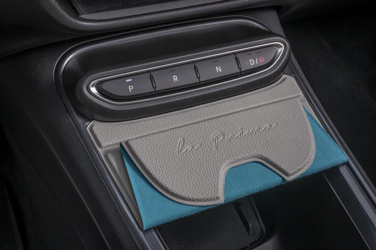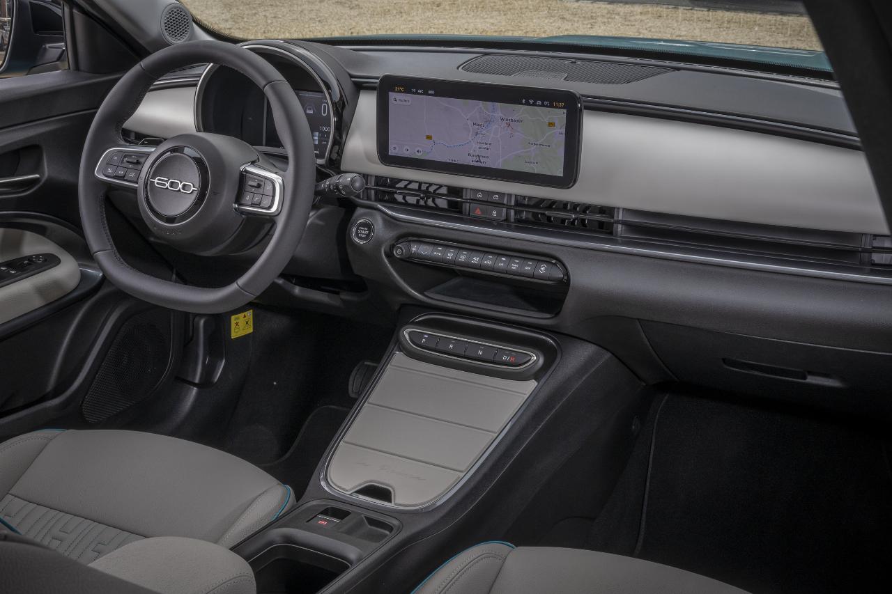 Etwas ungewöhnlich, aber wohl der Elektro-Herkunft geschuldet, befinden sich die Getriebewahlschalter als Tastenleiste in der Mittelkonsole. Das schafft zumindest Platz für ein großes Fach im Mitteltunnel, das durch eine ebenso einfache wie praktisch klappbare Segmentabdeckung geschützt wird. In der Topversion „La Prima“ farblich geschmackvoll, ebenso wie das Dashboard und Armauflagen in den Türen, in hellgrau abgesetzt, verleiht es dem ansonsten trist-schwarz gehaltenen Interieur einen pfiffigen Touch. Auch die großflächig in die Sitze eingestickten Fiat-Schriftzüge sind ein echter Hingucker.