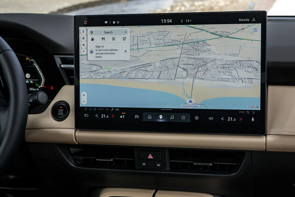 Auch die Bedienung trägt maßgeblich zu diesem Eindruck bei. Im Cockpit vollzieht Mazda einen deutlichen Schritt in Richtung Digitalisierung. Statt des bisherigen Dreh-Drück-Stellers dominiert nun ein großes Touchdisplay, wahlweise mit 12,9 oder 15,6 Zoll Diagonale. Die Oberfläche ist widgetbasiert aufgebaut, erinnert an Smartphones und lässt sich individuell konfigurieren. Google-Dienste wie Maps oder der Play Store sind serienmäßig integriert, künftig soll sogar der KI-Sprachassistent Gemini Einzug halten.