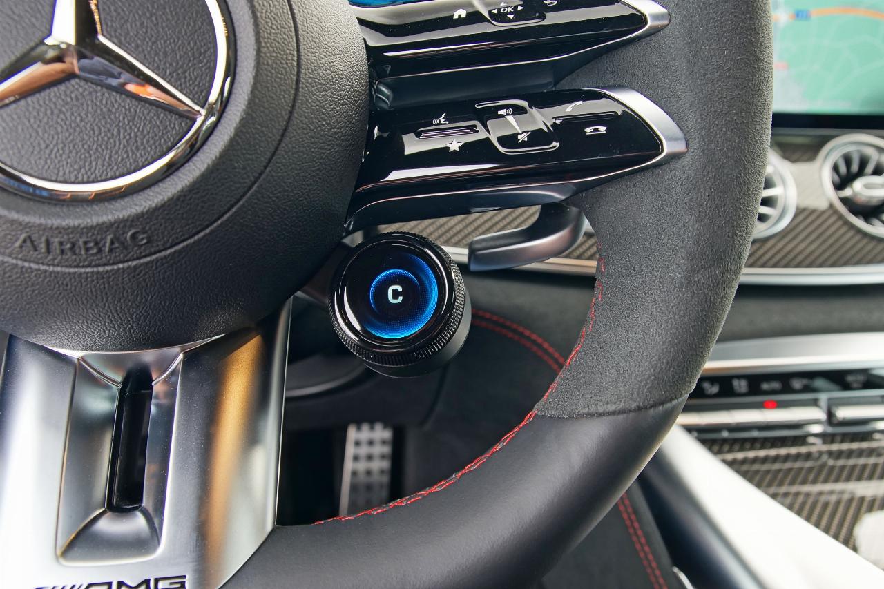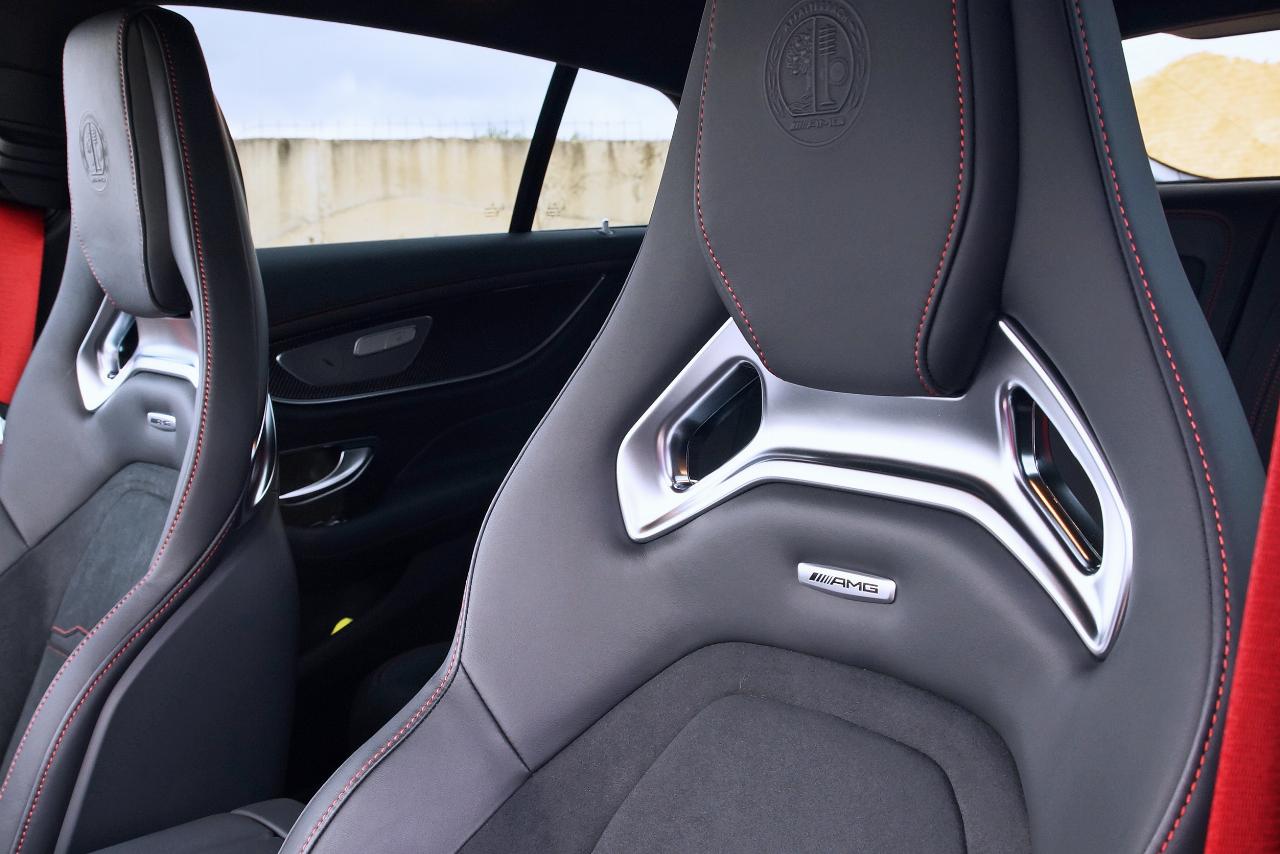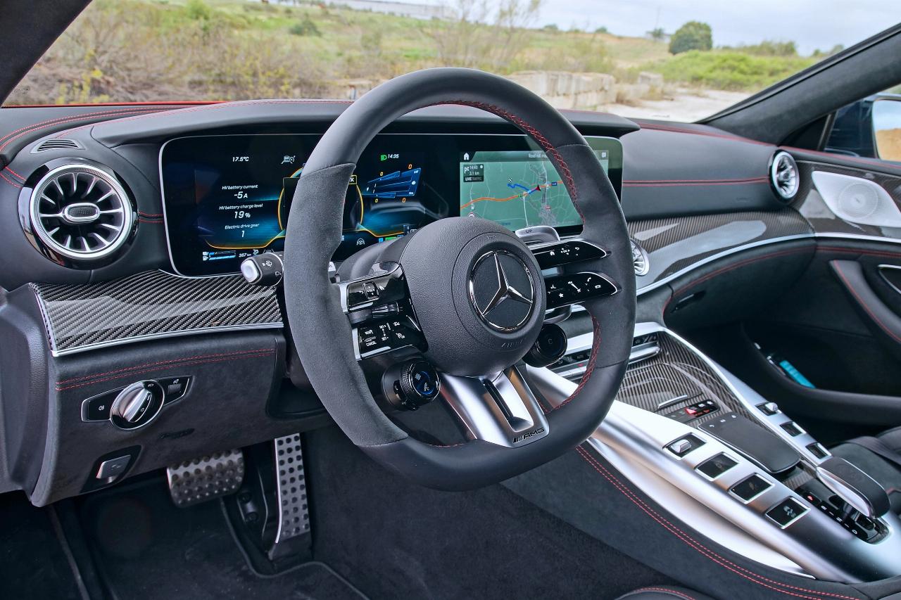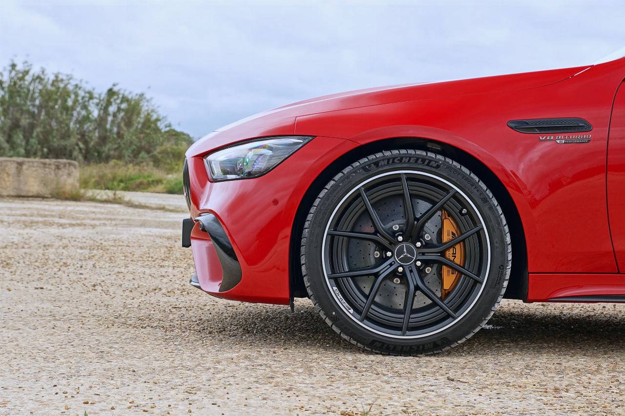 Das Luftfahrwerk kommt mit der Leistung und den fast 2,4 Tonnen Gewicht zu zurecht, wurde jedoch anders abgestimmt, um Rolleffekten entgegenzuwirken. Mit neuen Dämpfern, die über außenliegende Ventile verfügen, wurde eine um 200 Prozent größere Spreizung erreicht, Zug- und Druckstufe lassen sich jetzt erstmals unabhängig voneinander ansteuern. Zwei Drittel des Potentials wurden nach Kundenrückmeldungen in besseren Komfort investiert, AMG sagt jedoch, das Auto sei auch agiler geworden. Übrigens will der GT 63 S E Performance den Fahrstil des Fahrers erkennen und sich entsprechend anpassen. Hobby-Renningenieure können mannigfache Daten aufzeichnen und am heimischen Rechner auswerten.