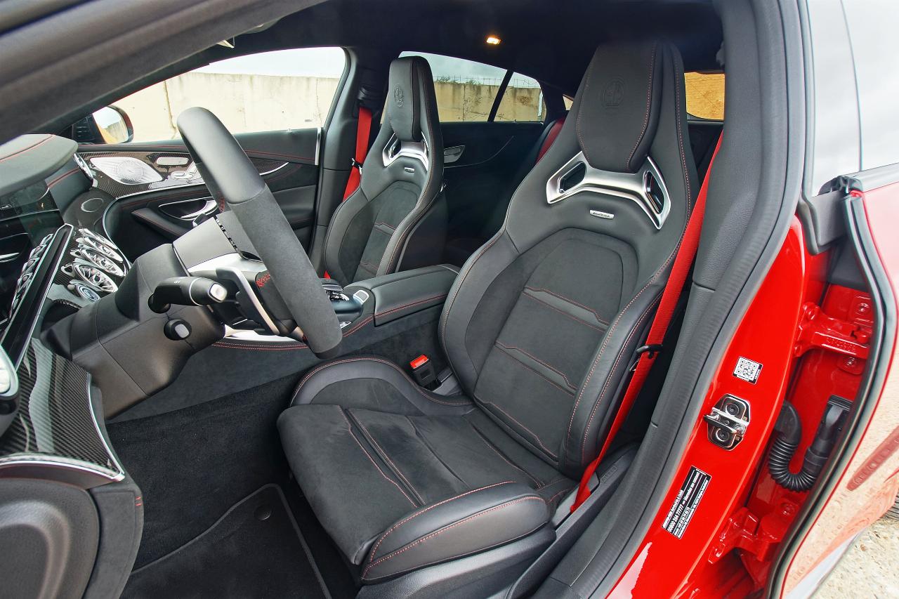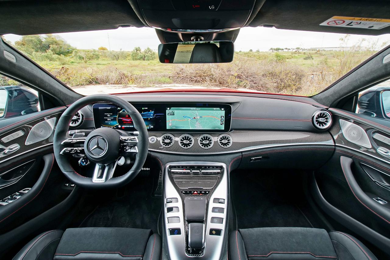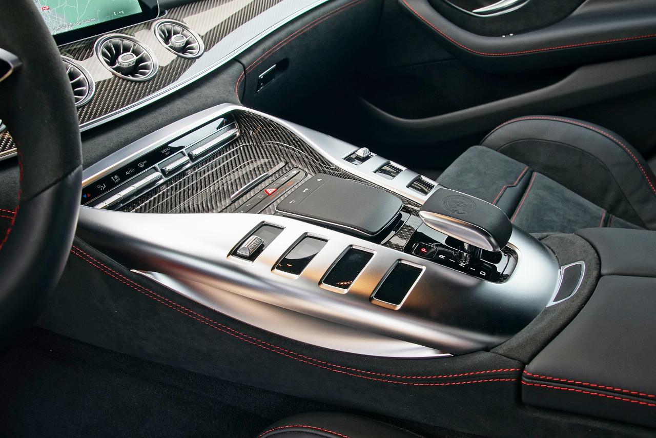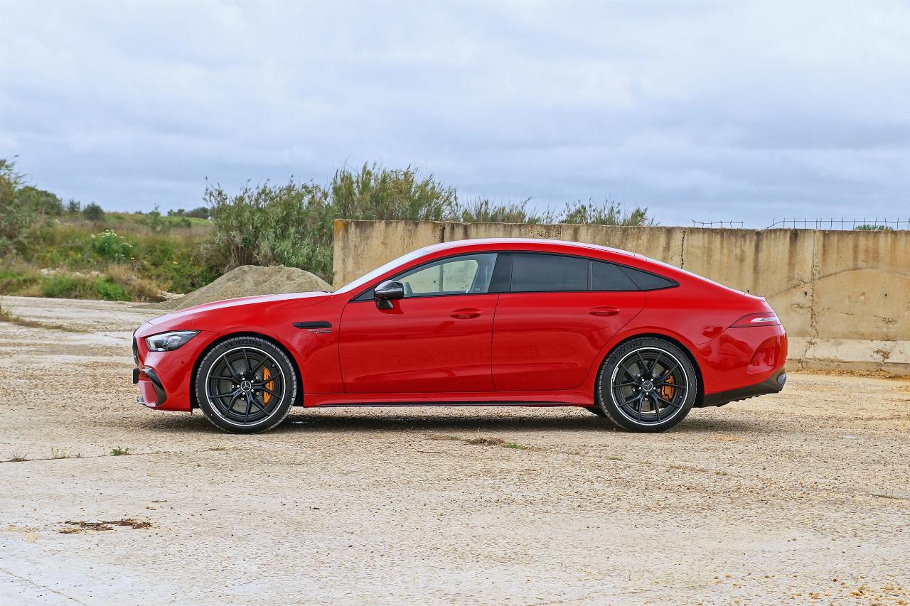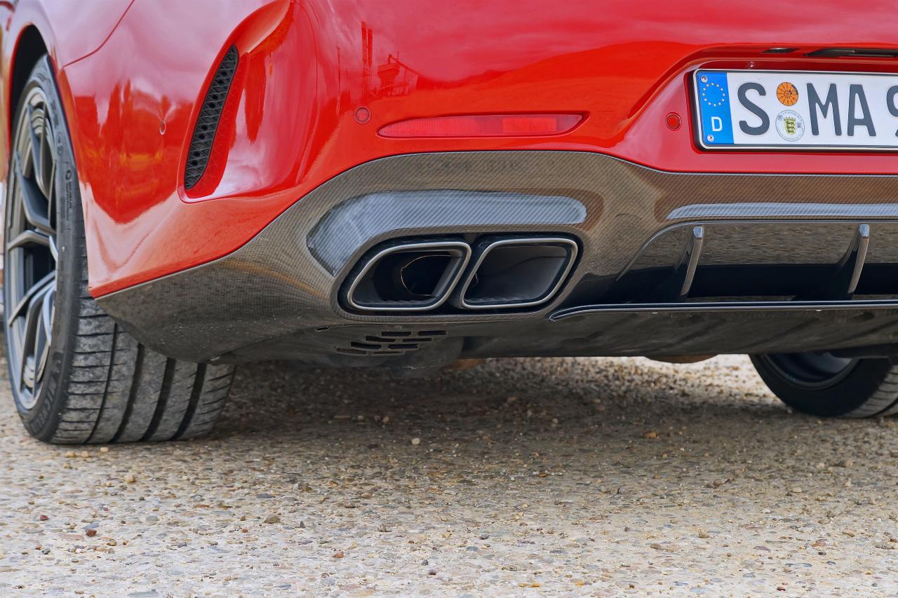 Das Luftfahrwerk kommt mit der Leistung und den fast 2,4 Tonnen Gewicht zu zurecht, wurde jedoch anders abgestimmt, um Rolleffekten entgegenzuwirken. Mit neuen Dämpfern, die über außenliegende Ventile verfügen, wurde eine um 200 Prozent größere Spreizung erreicht, Zug- und Druckstufe lassen sich jetzt erstmals unabhängig voneinander ansteuern. Zwei Drittel des Potentials wurden nach Kundenrückmeldungen in besseren Komfort investiert, AMG sagt jedoch, das Auto sei auch agiler geworden. Übrigens will der GT 63 S E Performance den Fahrstil des Fahrers erkennen und sich entsprechend anpassen. Hobby-Renningenieure können mannigfache Daten aufzeichnen und am heimischen Rechner auswerten.