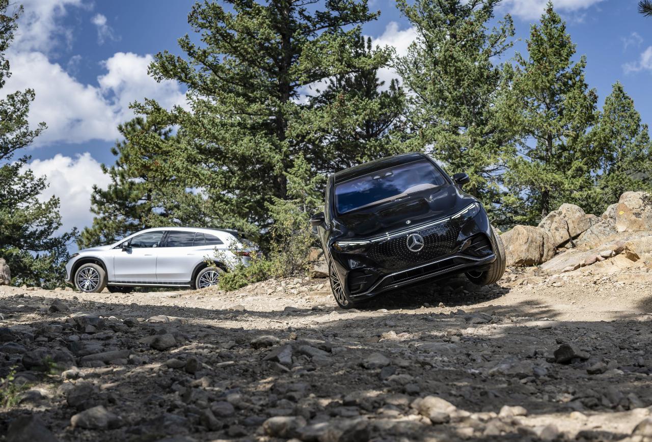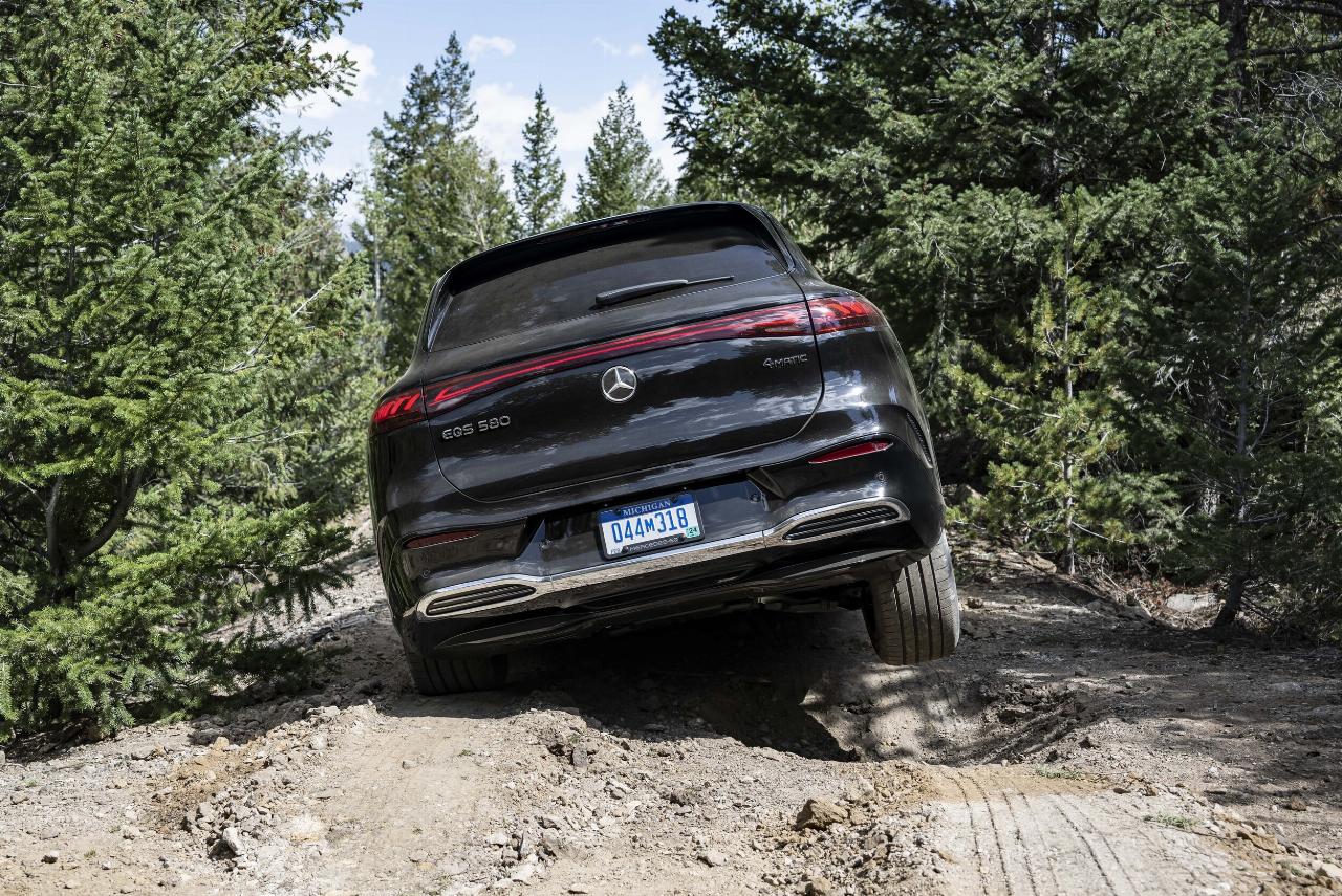 Überrascht hat die Leistung auf dem anschließend gefahrenen Offroad-Parcours. Steilfahrten und tiefe Löcher, die ein gewöhnlicher SUV auf den ersten Blick nicht schaffen würde, waren im EQS per Vorwahl des Offroad-Modus möglich, und im Notfall lässt sich die Bodenfreiheit nochmals um 20 mm erhöhen. Die im unteren Teil der Fahrzeugkarosserie montierte Kamera zeigt die Situation direkt vor dem Fahrzeug, die wegen der großen und hohen Fronthaube eigentlich nicht sichtbar wäre, was das Fahren in unübersichtlichem Gelände erheblich erleichtert.