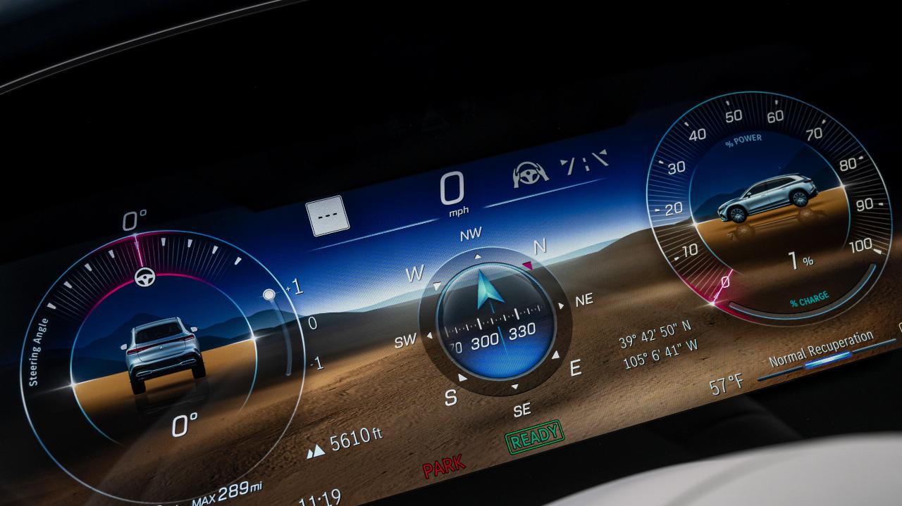 Für das Startritual ist der von anderen Mercedes-Benz Modellen bekannte Kunststoffhebel an der Lenksäule zu betätigen; der Kristallwählhebel, der derzeit bei High-End-Modellen im Trend liegt, bleibt eventuell Maybach überlassen. Die Fahrt ab der Innenstadt von Denver lief reibungslos und angenehm, nicht zuletzt dank der hervorragenden Sitzposition und der deutlich höheren Karosserie. Auf dem Freeway fließt der Verkehr dank einem Tempolimit von 120 km/h erheblich schneller als in anderen US-Staaten. Dennoch könnte der EQS SUV 450+ noch mehr: Er sprintet nicht nur in 6,7 Sekunden von 0 auf 100 km/h, sondern er schafft auch eine Höchstgeschwindigkeit von abgeregelten 210 km/h. Es empfiehlt sich also, auf Autobahnpatrouillen zu achten.